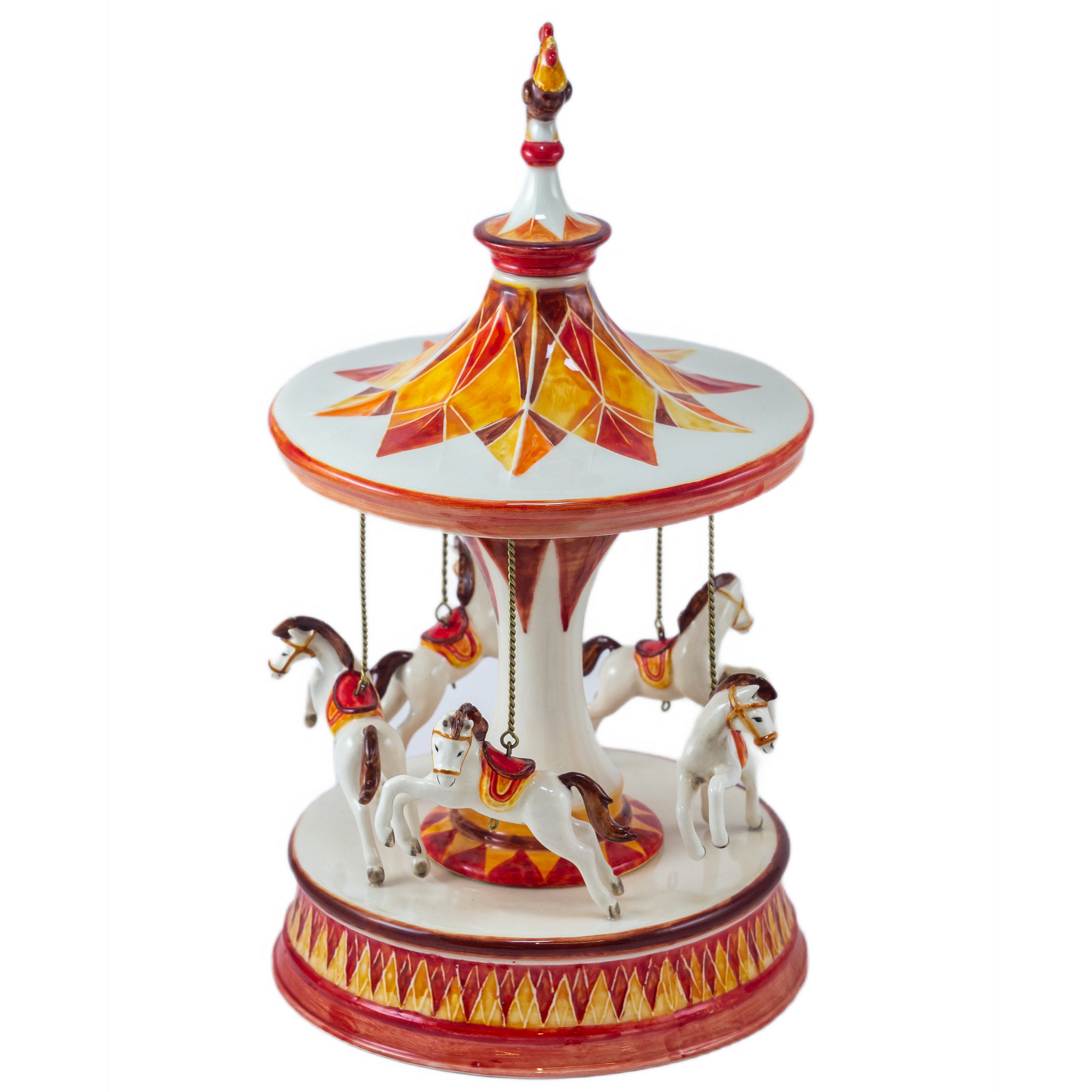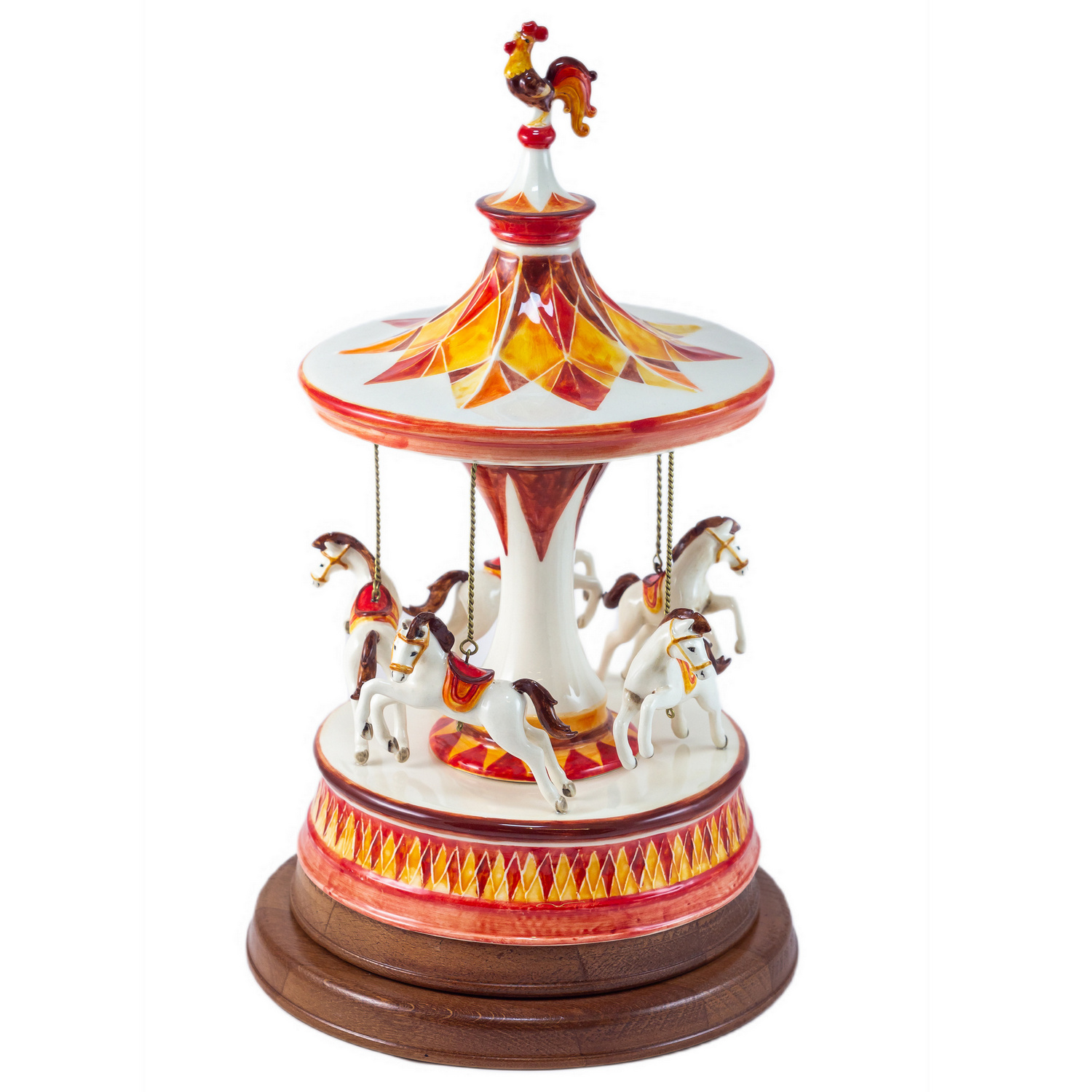 Фарфоровая карусель — это воплощение детской мечты, ожившее в изысканной форме. Ее ярко-красная шатровая крыша, украшенная золотистыми гранями, увенчана фигуркой петуха — символом пробуждения и радости. Вокруг центральной колонны, словно заколдованные в моменте движения, парят изящные лошадки, каждая из которых подвешена на тонкой цепочке и детализирована вручную. Их белоснежные тела контрастируют с красными седлами и гривами в теплых оттенках, придавая композиции праздничное звучание.