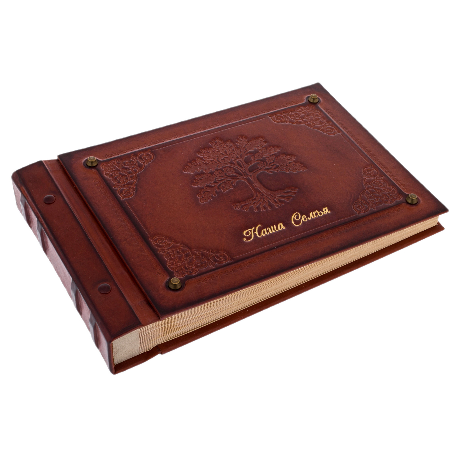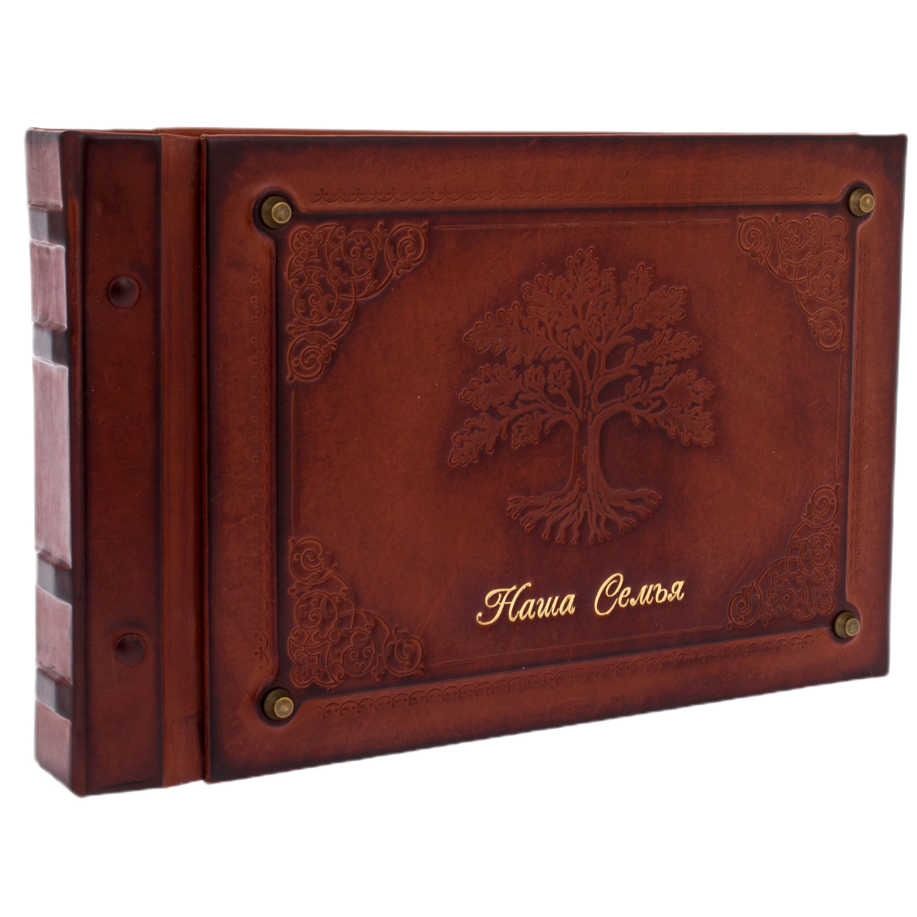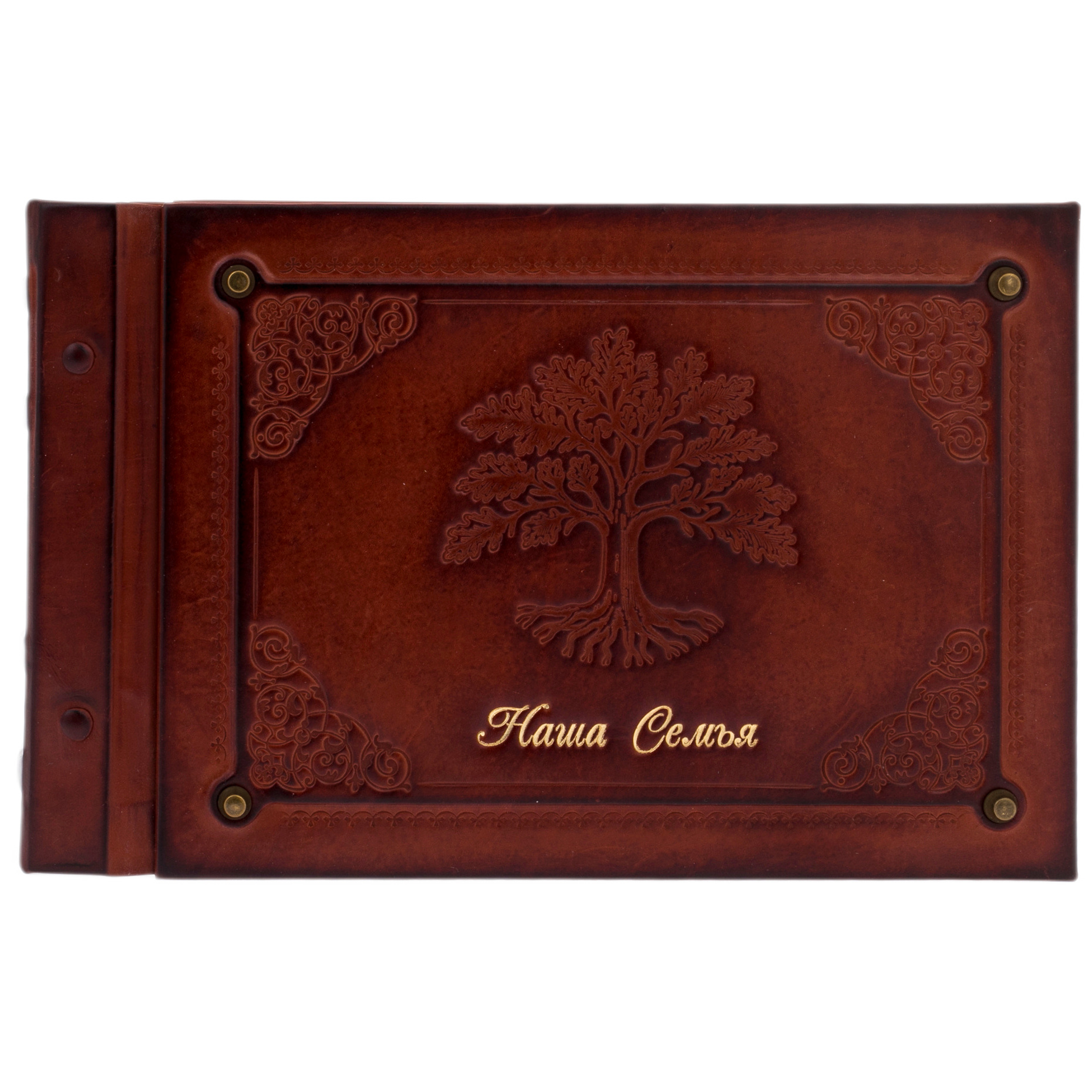 Фотоальбом из натуральной кожи «Наша семья» — тёплый и символичный подарок для тех, кто ценит родовые традиции и семейную память. Обложка из гладкой кожи тёплого коньячного оттенка украшена тиснением с изображением дерева — символа рода, с его корнями и ветвями, объединяющими поколения. Золотое тиснение надписи добавляет изысканности и подчёркивает важность содержания.