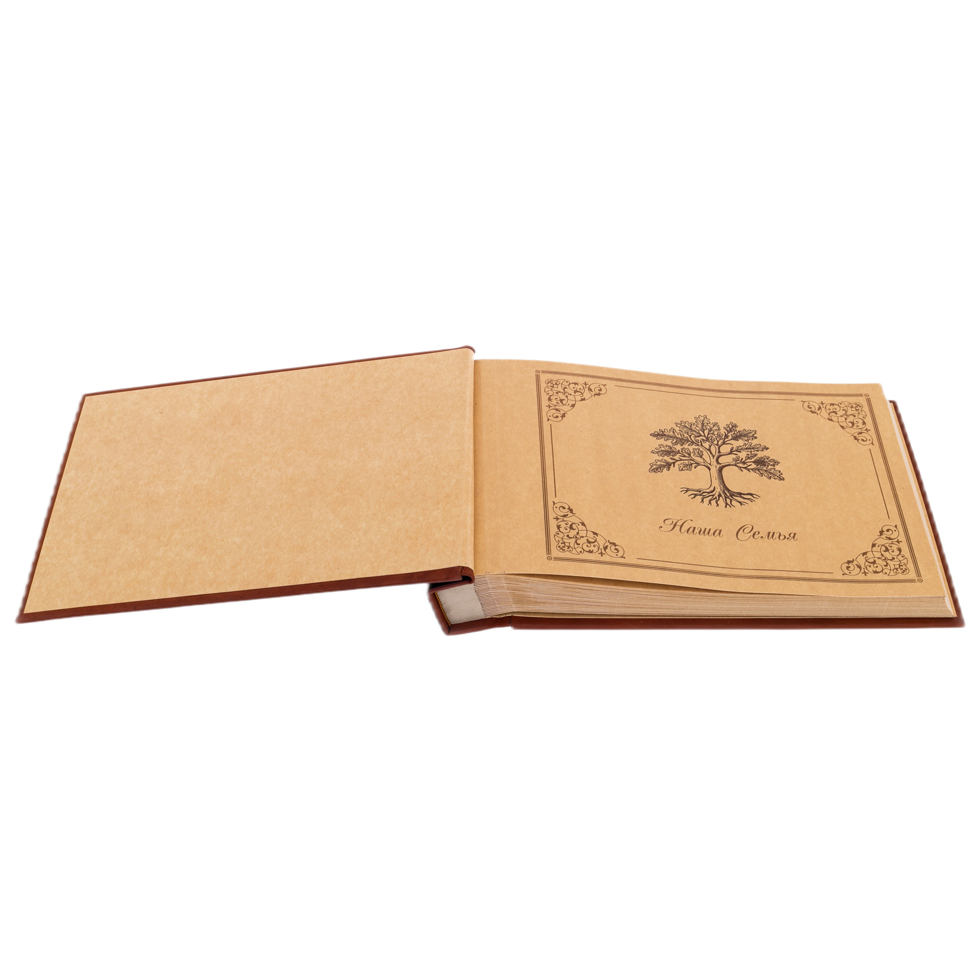 Внутри — плотные страницы с бумагой, предназначенные для фотографий, памятных записей и семейных историй. Каждая страница словно приглашает к диалогу поколений — от первых шагов до значимых дат, от старинных снимков до новых воспоминаний.