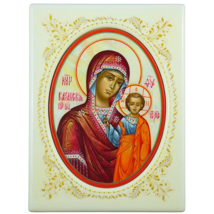 Икона с перламутром "Казанская Богоматерь" в белой раме