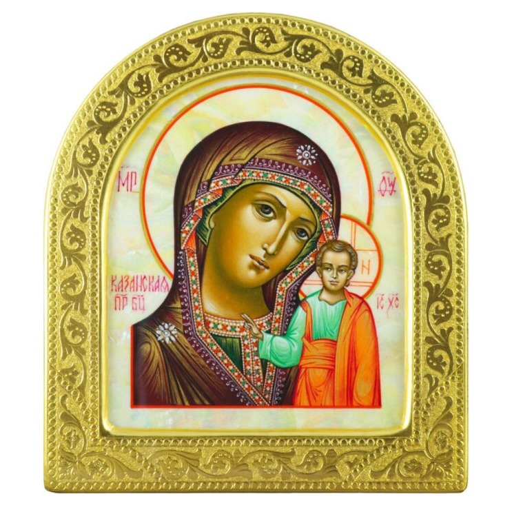 Икона с перламутром "Казанская Богоматерь" в золотой раме (арка)