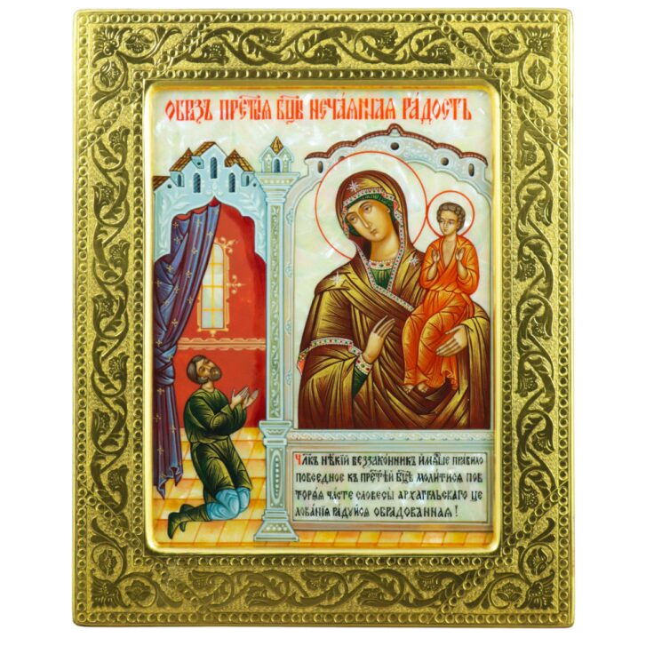 Икона "Богоматерь Нечаянная Радость" на натуральном перламутре в золотой раме