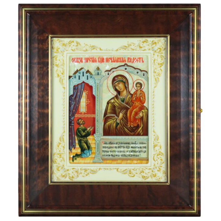Икона "Богоматерь Нечаянная Радость" в белой раме и киоте на натуральном перламутре