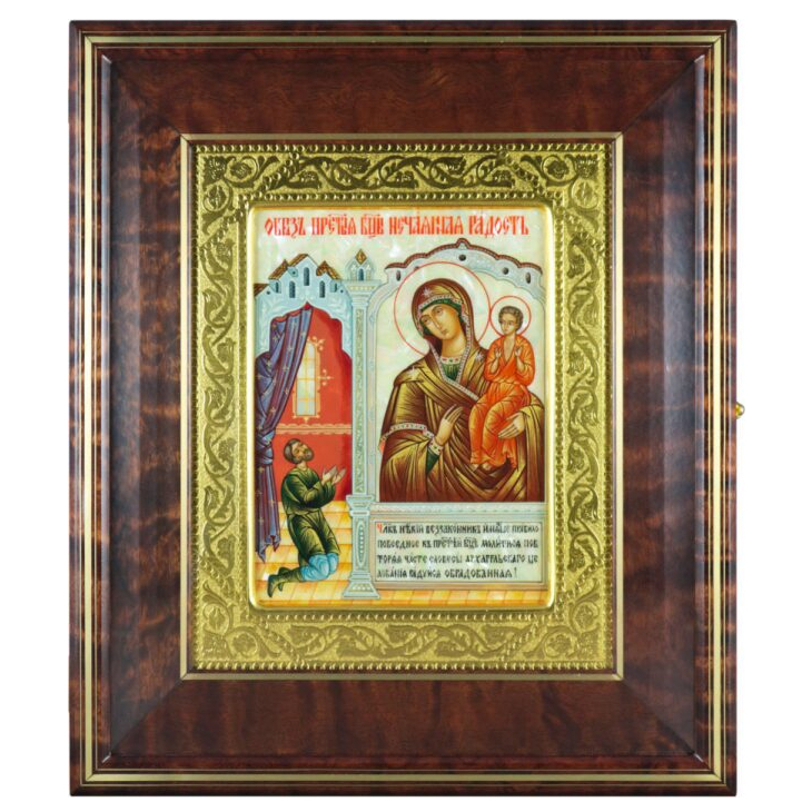 Икона "Богоматерь Нечаянная Радость" в киоте и золотой раме на натуральном перламутре
