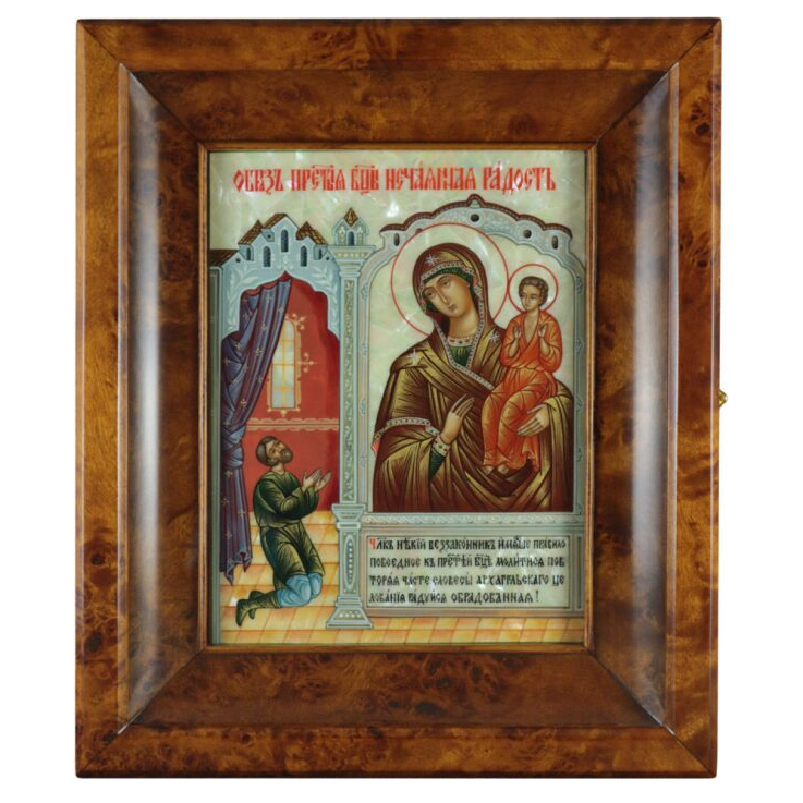 Икона на натуральном перламутре "Богоматерь Нечаянная Радость" в киоте
