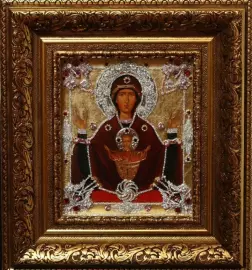 Икона Божией Матери "Неупиваемая чаша" Икона Божией Матери "Неупиваемая чаша" Икона Божьей Матери Неупиваемая чаша – одна из любимейших и почитаемых чудотворных икон. Руки Божьей Матери воздеты в молитвенном жесте, что характерно для иконописного типа «Оранта» (лат. - молящаяся). Главу Царицы Небесной венчает корона, на руках изображены поручи, как элемент священнического облачения, символизирующий сослужение Первосвященнику Христу. На переднем плане в чаше стоит Богомладенец, благословляющий молящихся обеими руками. Чаша представляет собой Потир со Святыми Дарами - неистощимым источником духовных сил и утешения. Согласно сложившейся церковной традиции перед иконой «Неупиваемая Чаша» молятся об избавлении от пьянства, наркомании, курения, игромании и других пагубных зависимостей. Оклад выполнен из биметаллического листа, представляющего собой соединенные вместе методом горячей прокатки две пластины: из серебра 925-й (или 998-й пробы) толщиной 0.02-0.3 мм и алюминия, который необходим для придания прочности конструкции. Основание выполнено из МДФ средней плотности, пластика, кожзаменителя, стекла или других материалов. Изображение наносится методом цифровой шелкографии. Металлический оклад, частично, декорирован золотым лаком и цветной эмалью. Поверхность иконы покрыта особым защитным составом. Иконы имеют сертификат изготовителя, а также проходят госконтроль пробирной инспекции РФ, что гарантирует юридическую безопасность для покупателей. Иконы - дорогие и благородные подарки, которые преподносят от чистого сердца с пожеланиями любви и добра. Они могут стать настоящей семейной святыней, передающейся по наследству.