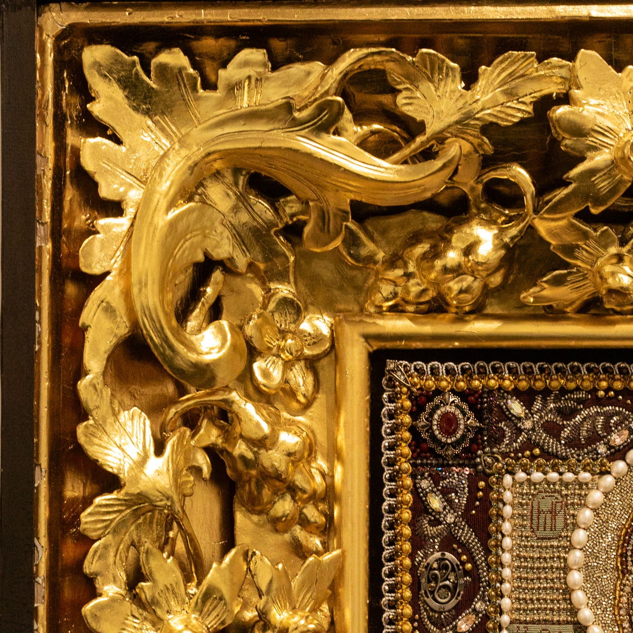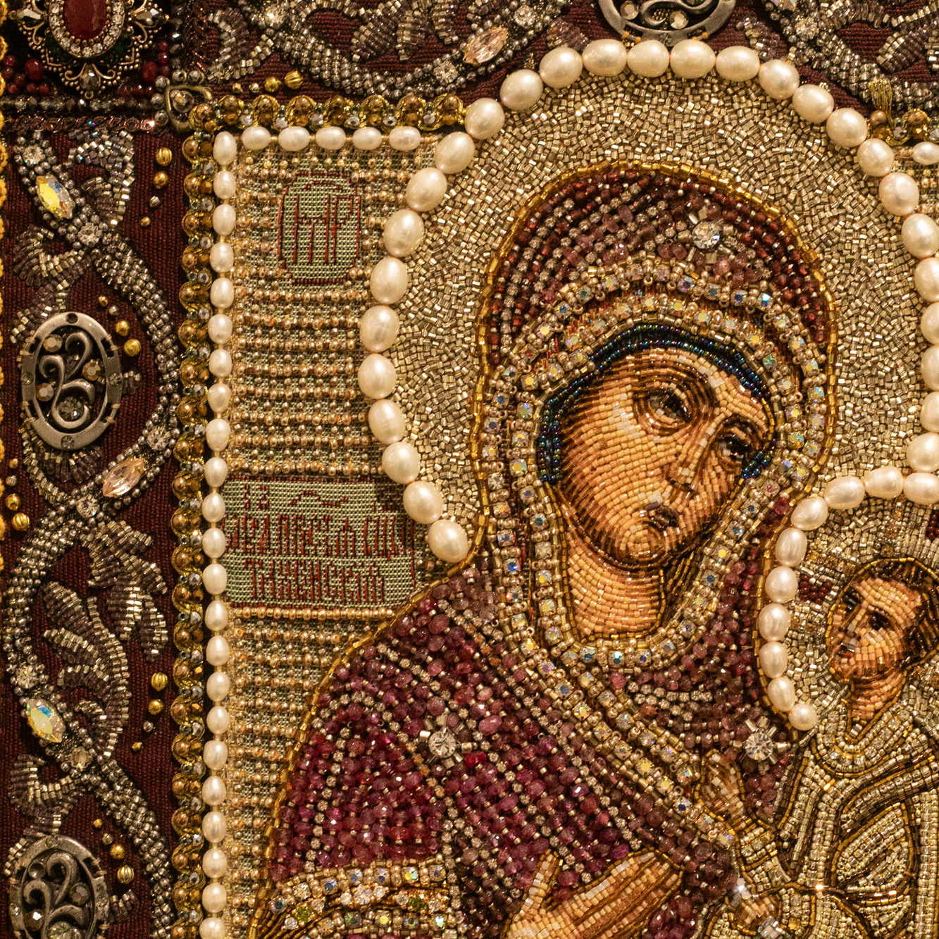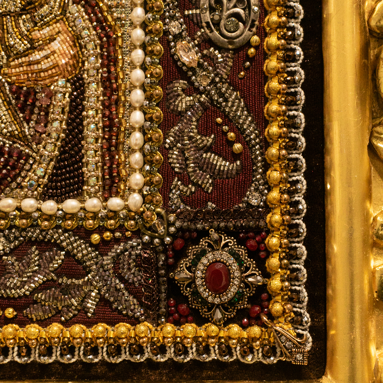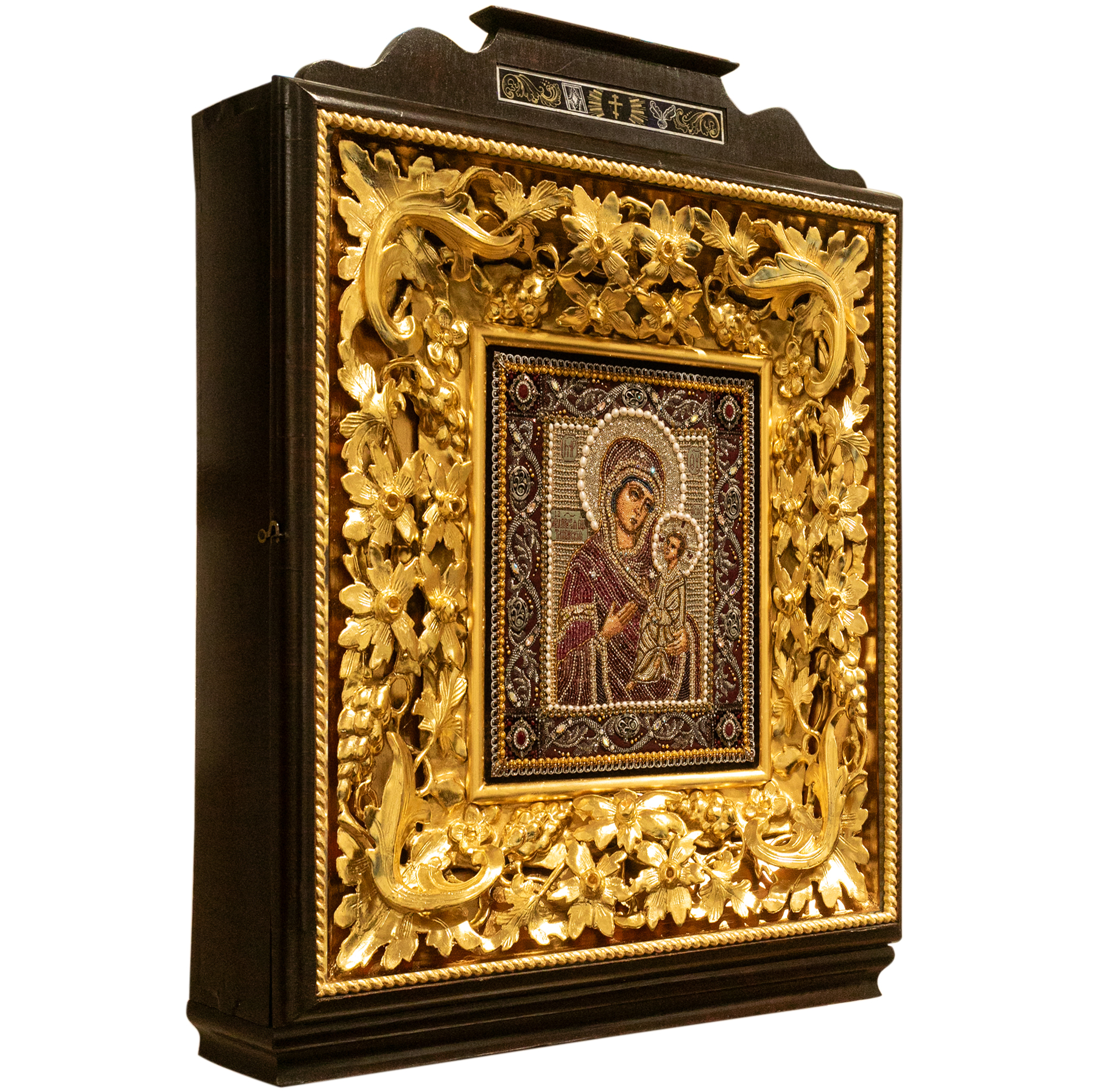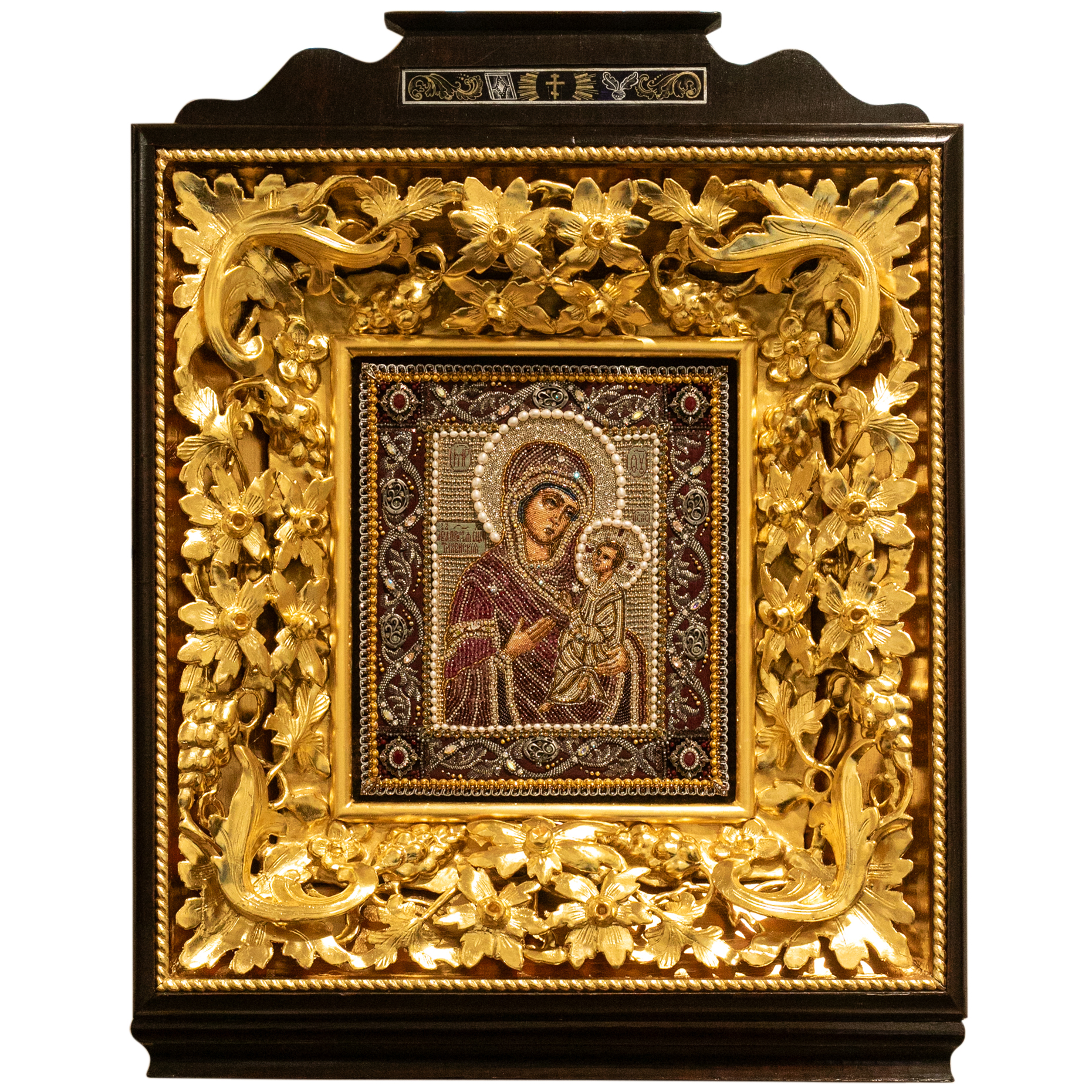 Вышитая икона "Пресвятая Богородица Тихвинская" в антикварном киоте