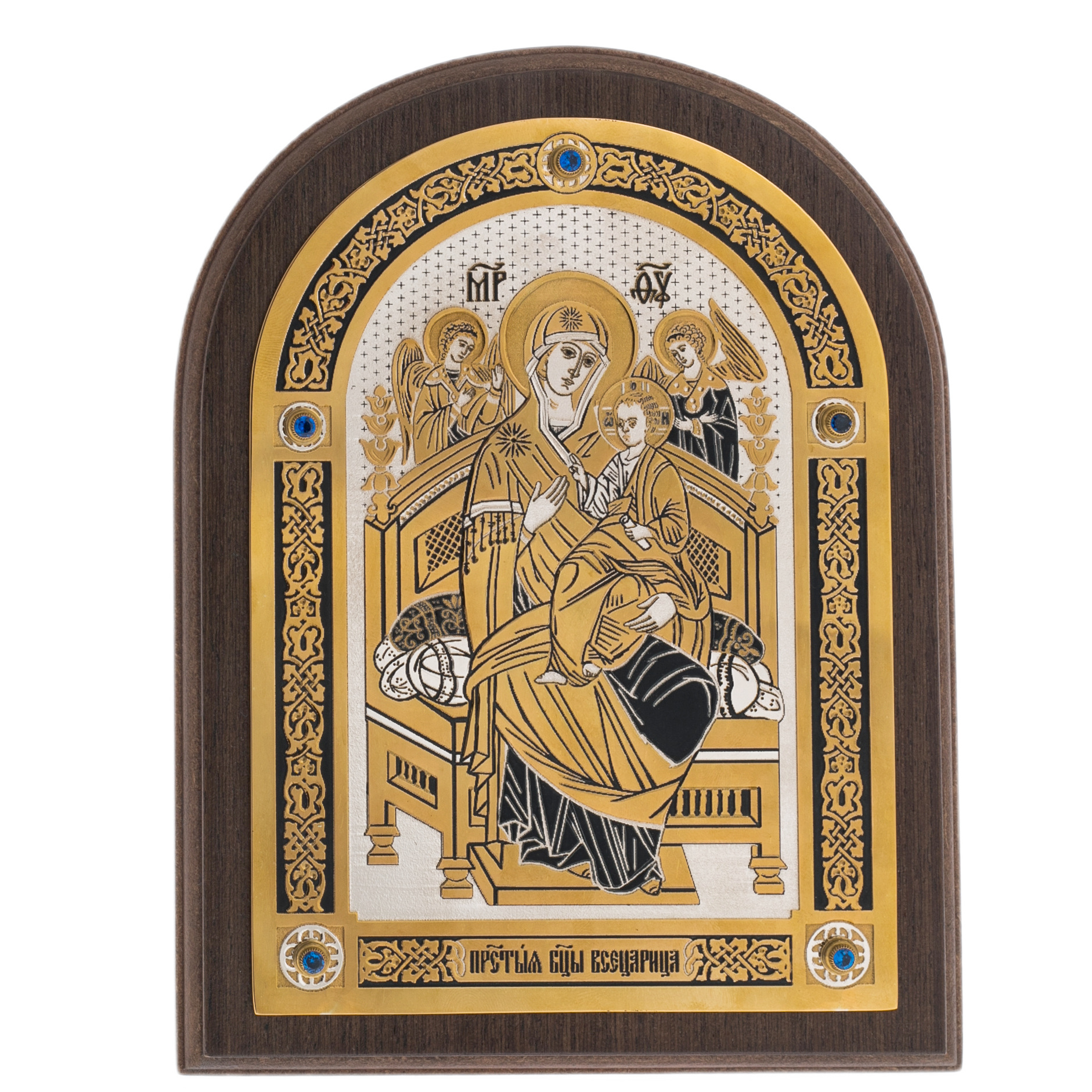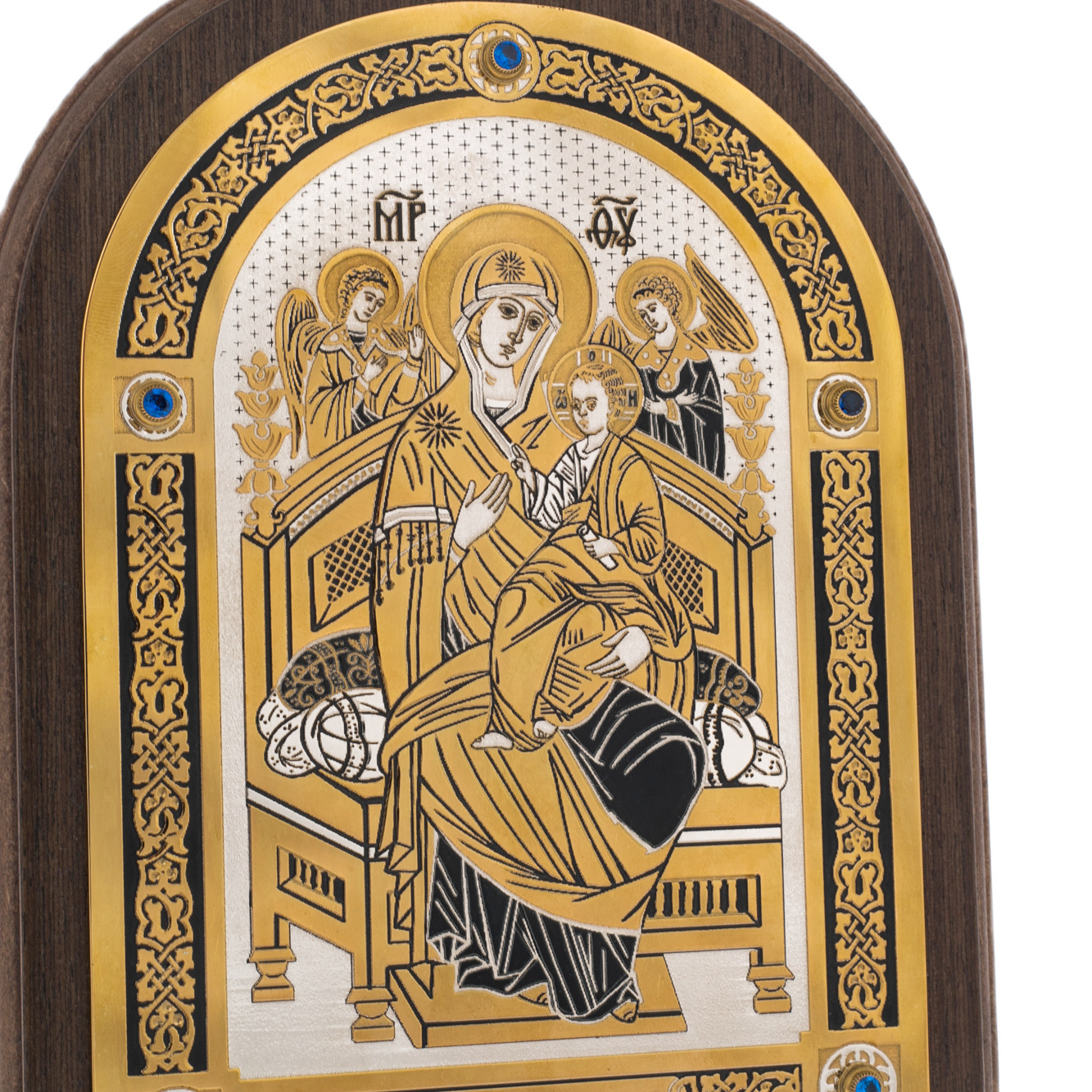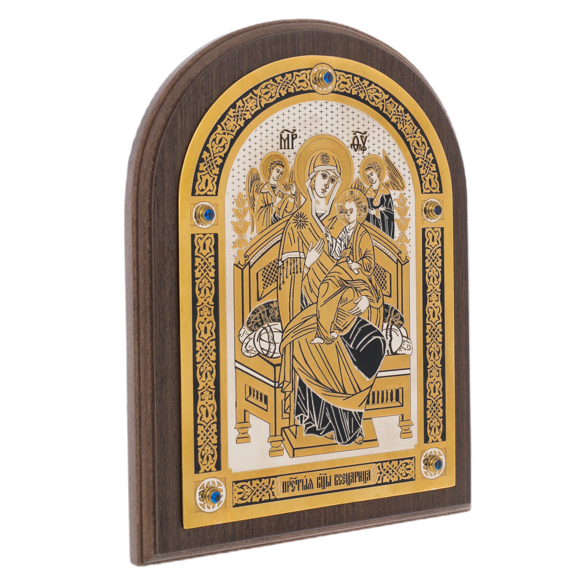 Икона "Всецарица" — образ, пробуждающий благоговение. Богородица изображена в величественном покое, восседающей на престоле, с Младенцем Христом на руках, окружённой архангелами. Чистота линий, благородная строгость и торжественность композиции рождают ощущение небесной иерархии, сосредоточенности и света. Лик Богородицы полон тихой решимости, а фигура Христа — внутренней силы. Всё изображение заключено в арочное обрамление, украшенное витиеватым орнаментом и сияющими вставками из кристаллов, в центре которых — искусно инкрустированные синие камни, добавляющие иконе торжественного блеска. Изделие закреплено на подставке из тёмного дерева, благодаря которой икона может быть размещена на столе, полке или в домашнем иконостасе.