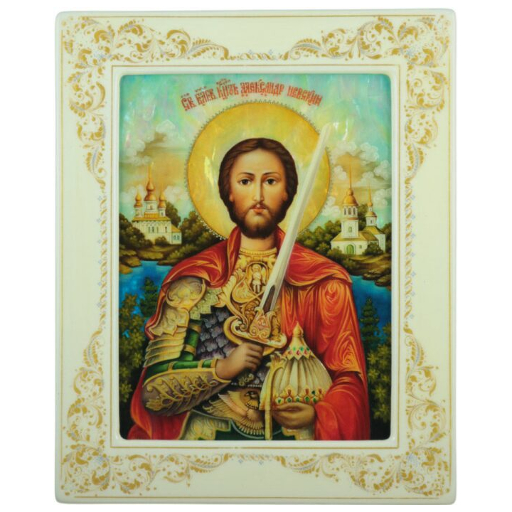 Икона "Икона святой благоверный князь Александр Невский" с перламутром в белой раме