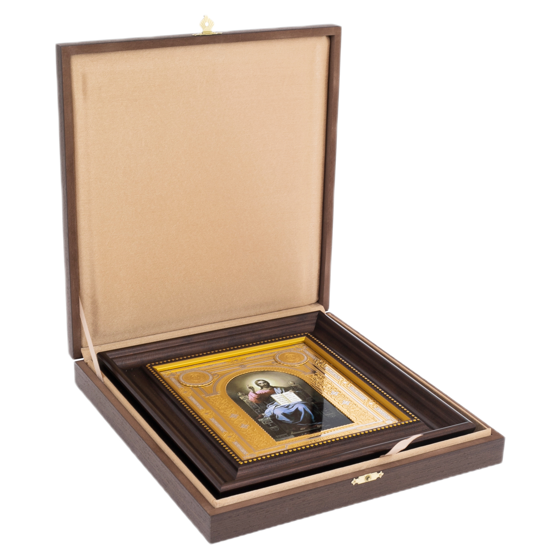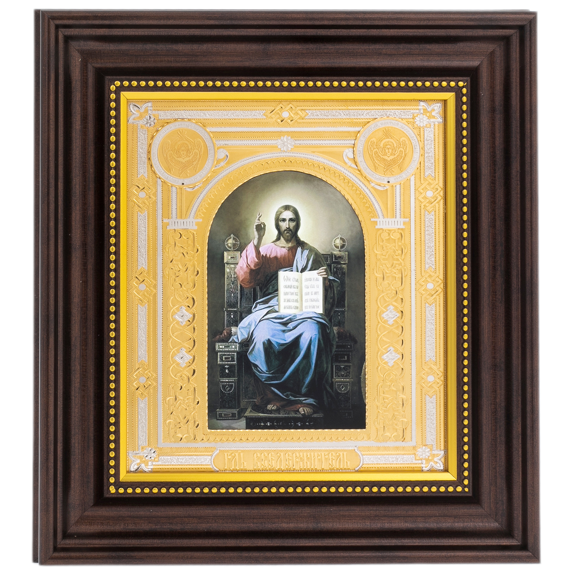Икона "Господь Вседержитель" в подарочном оформлении — изысканное произведение православного искусства, созданное с применением златоустовской техники. Изображение Спасителя, сидящего на троне, выполнено с особой глубиной и выразительностью, отражающей традиции иконописи и духовную значимость образа. Рама из благородного дерева украшена тончайшей гравировкой с золотым и серебряным тиснением, создавая атмосферу торжественности и почтения. Это изделие предназначено для истинных почитателей православной культуры, желающих украсить дом или храм достойным символом веры.