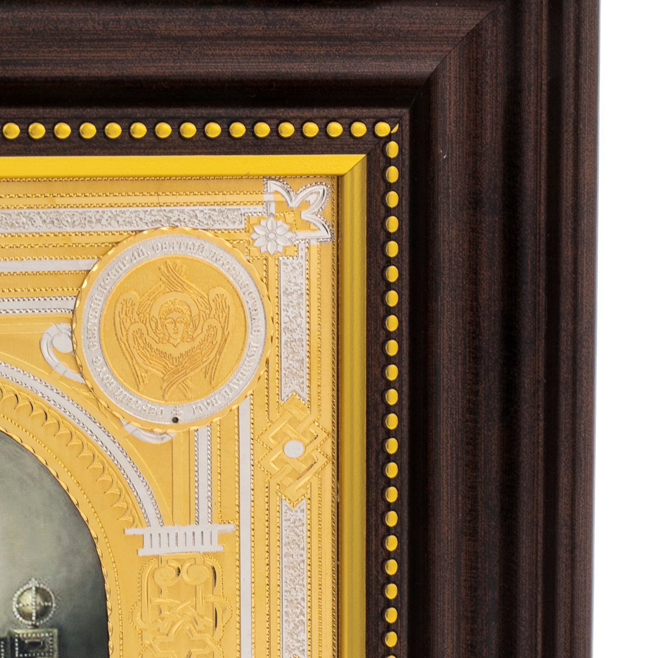 Златоустовская техника, применённая в оформлении иконы, представляет собой искусство филигранной гравировки и золочения, передающее тончайшие детали и орнаментальные мотивы с максимальной точностью. Мастера используют многоступенчатую работу с металлом, добиваясь эффекта глубины и благородного сияния, что подчёркивает духовное и художественное значение изображения. Такое оформление придаёт иконе исключительную ценность и уникальность, сохраняя вековые традиции российского ремесла.