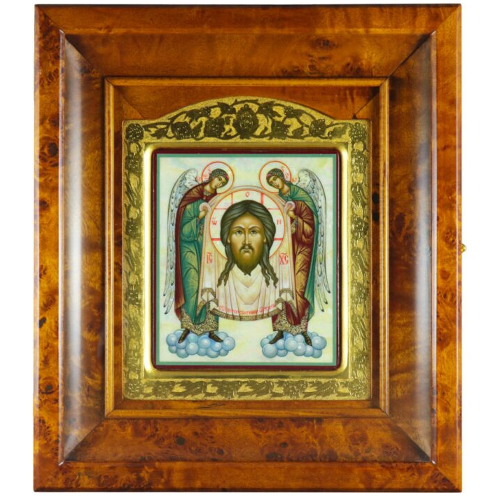 Икона "Спас Нерукотворный" в золотой раме и киоте на натуральном перламутре