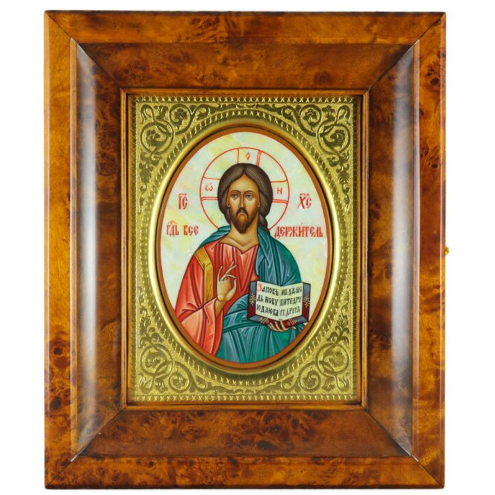 Икона на натуральном перламутре "Спаситель" в золотой раме и киоте