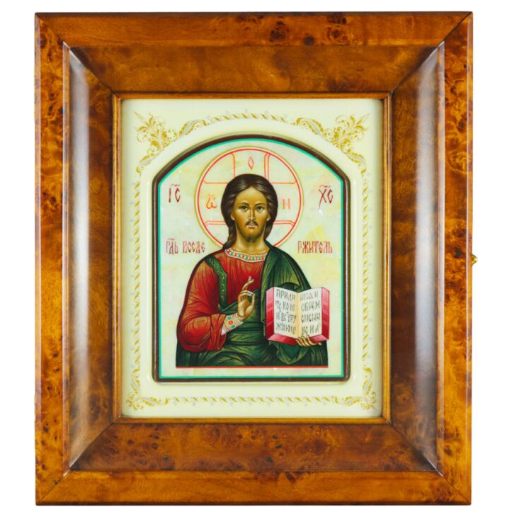 Икона в белой раме и киоте "Спаситель" на натуральном перламутре