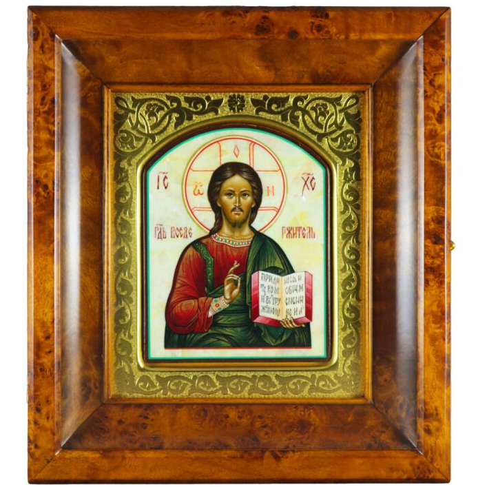 Икона в золотой раме и киоте "Спаситель" на натуральном перламутре