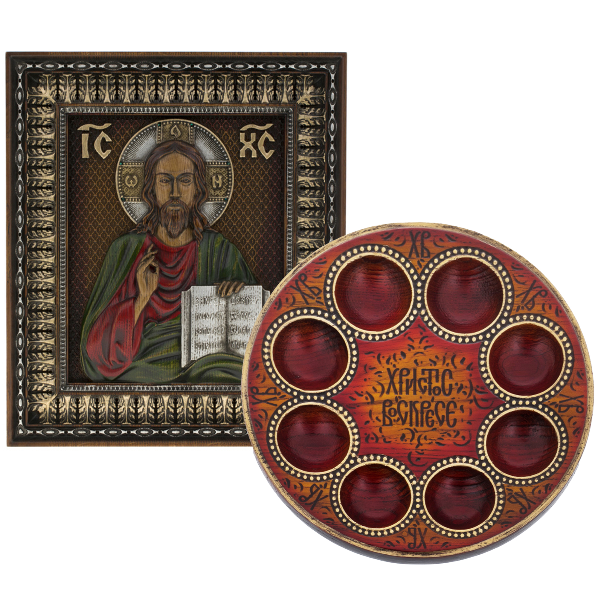 Подарочный набор, включающий деревянную икону «Господь Вседержитель» и пасхальную тарелку для яиц, представляет собой тонкое единение духовной силы, благородства природных материалов и русского ремесленного искусства.