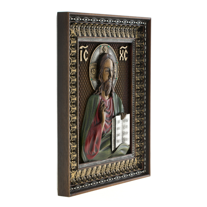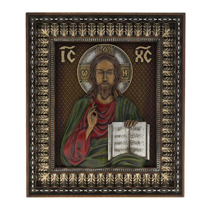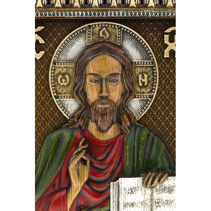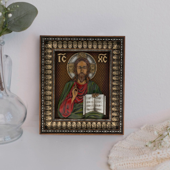 Икона «Господь Вседержитель» исполнена на массиве ценной породы дерева, с каноничным образом Спасителя, передающим величие, мудрость и всепрощающий взгляд. Благородный тон древесины и глубокая проработка образа создают в доме атмосферу умиротворения и благоговения. Лик Иисуса Христа, написанный в соответствии с традициями православной иконописи, символизирует высшую истину и духовное руководство, которому следуют поколения.
