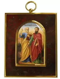 Икона "Святые Петр и Павел" с перламутром Икона "Святые Петр и Павел" с перламутром Святые Петр и Павел, столпы ранней Церкви, напоминают нам о силе веры и преобразующей мощи слова. Петр, первый из апостолов, символизирует твердую основу веры. В Евангелиях он описывается как один из самых преданных учеников Христа, несмотря на свои слабости и ошибки, ставший ключевой фигурой в основании христианской церкви. Согласно преданию, Петр был распят вниз головой, поскольку чувствовал себя недостойным умереть так же, как и его Господь. Павел, изначально известный как Савл, был рьяным преследователем христиан, но после своего обращения на пути в Дамаск стал одним из самых ревностных проповедников христианства. Его многочисленные письма в адрес ранних христианских общин легли в основу Нового Завета. Павел олицетворяет бесконечное стремление к распространению знания и укреплению веры. Икона "Святые Петр и Павел" — это не просто религиозный символ, это произведение искусства, которое сочетает в себе духовное величие и ремесленное мастерство. На ней изображены два святых, стоящих рядом друг с другом, что символизирует их совместные усилия в основании и укреплении Церкви. Петр держит в руке ключи, символизирующие его власть, данную ему Христом, а Павел — свиток, символизирующий его послания и вклад в распространение христианства. Окантовка иконы украшена сложными орнаментами в стиле традиционной русской иконописи, что придает ей особую красоту и значимость. Яркие краски и детализированные элементы делают икону не только духовным объектом, но и настоящим шедевром искусства. Икона "Святые Петр и Павел" идеально подходит для дома, молитвенного уголка или церковного помещения, добавляя туда атмосферу благоговения и умиротворения. Она станет ценным приобретением для тех, кто ищет утешение и вдохновение в своей вере, а также прекрасным подарком для близких, которые найдут в ней источник духовной поддержки и напоминание о божественном присутствии в их жизни. Эта икона вставлена в изящную рамку и хранится в роскошном футляре, что подчеркивает ее ценность и делает ее достойным подарком для любого верующего. Это произведение искусства, созданное с любовью и благоговением, обязательно найдет свое место в сердце и доме каждого, кто ценит духовность и культурное наследие.