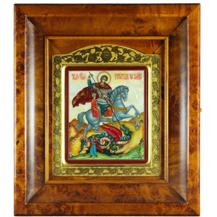 Икона "Георгий Победоносец" в золотой раме и киоте на натуральном перламутре