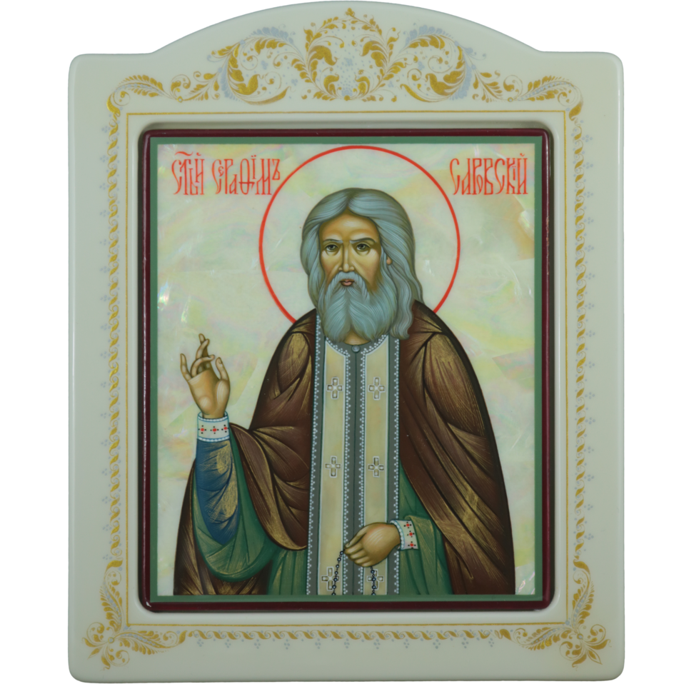 Икона на натуральном перламутре "Серафим Саровский" с сусальным золотом