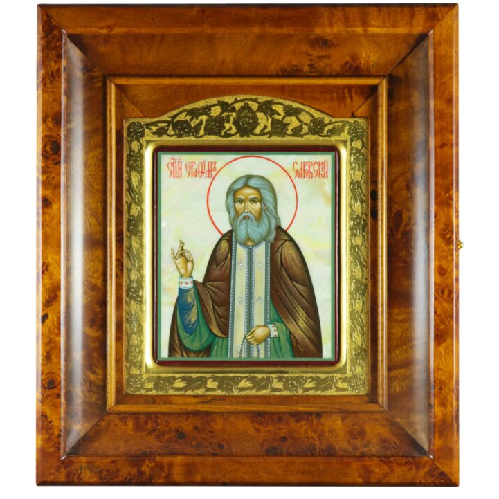 Икона "Серафим Саровский" в золотой раме и киоте на натуральном перламутре