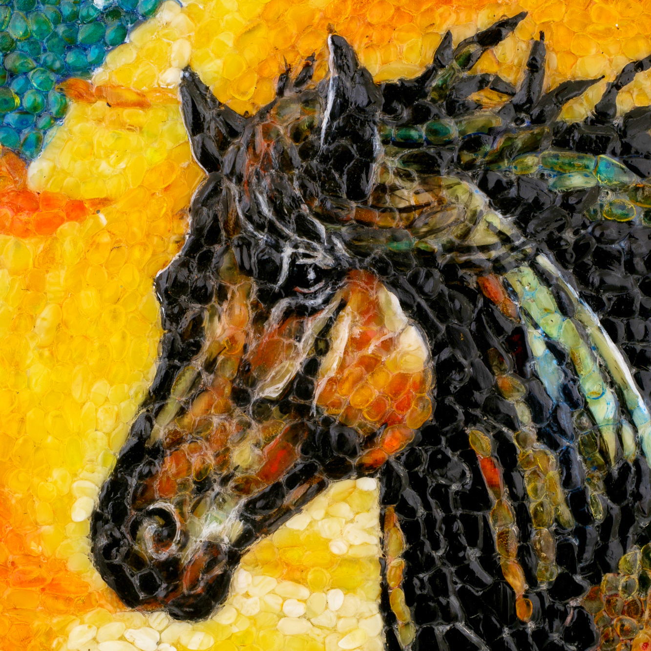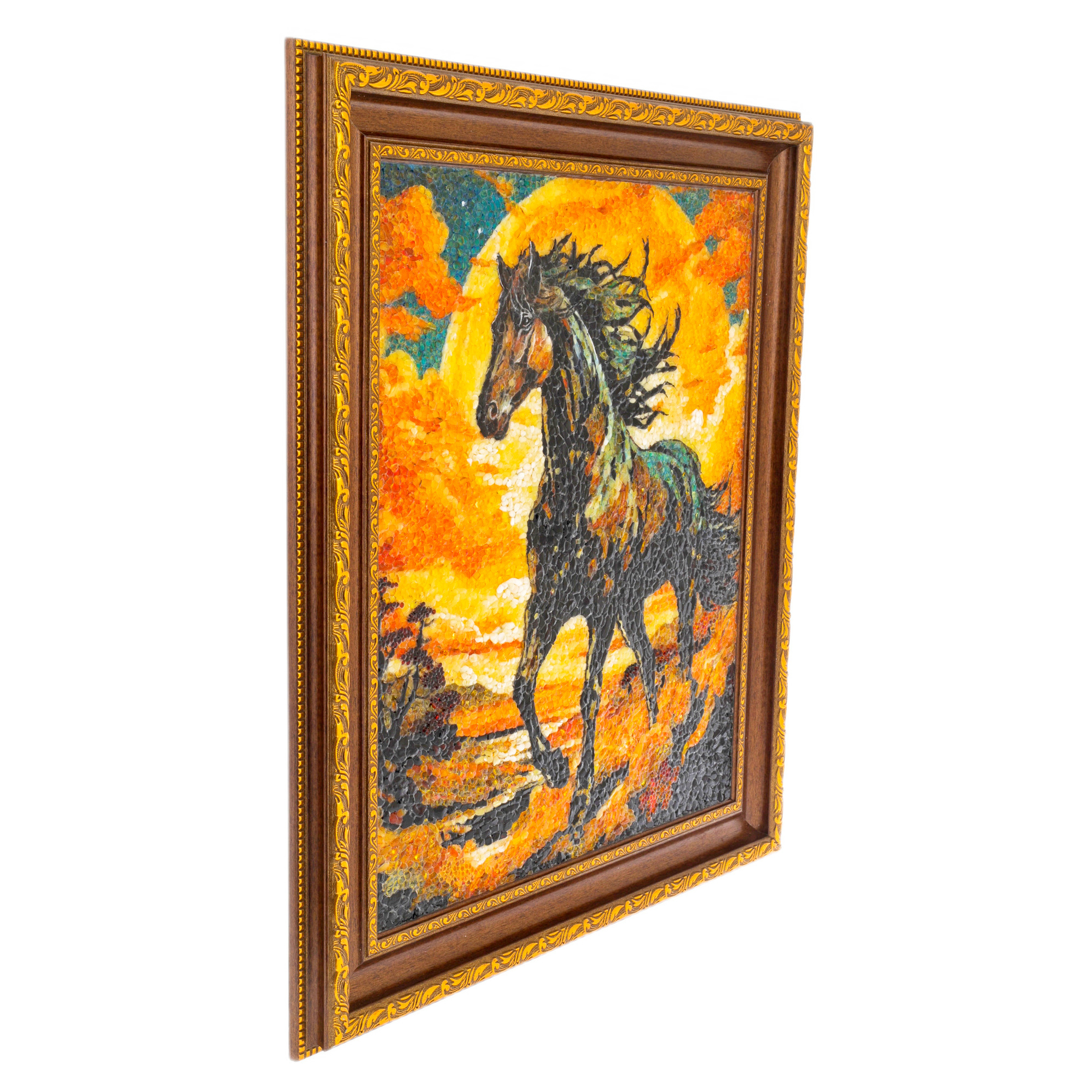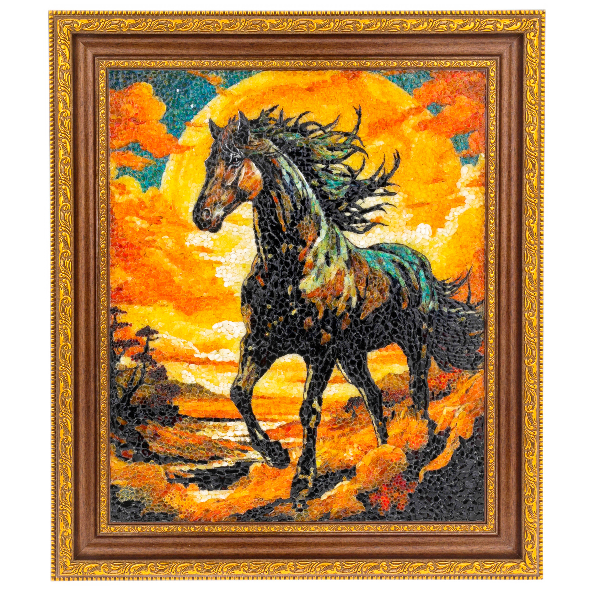 Мощные ноги скакуна, выложенные янтарем глубокого черного и коньячного оттенков, контрастируют с ярким небом, подчеркивая силу и грацию животного. Детализация настолько тонка, что создается впечатление, будто вот-вот услышится звук его галопа. Вокруг оживают элементы ландшафта: древние деревья и волнистая почва, выполненные из темных янтарных фракций, дополняют композицию глубиной и сложностью.