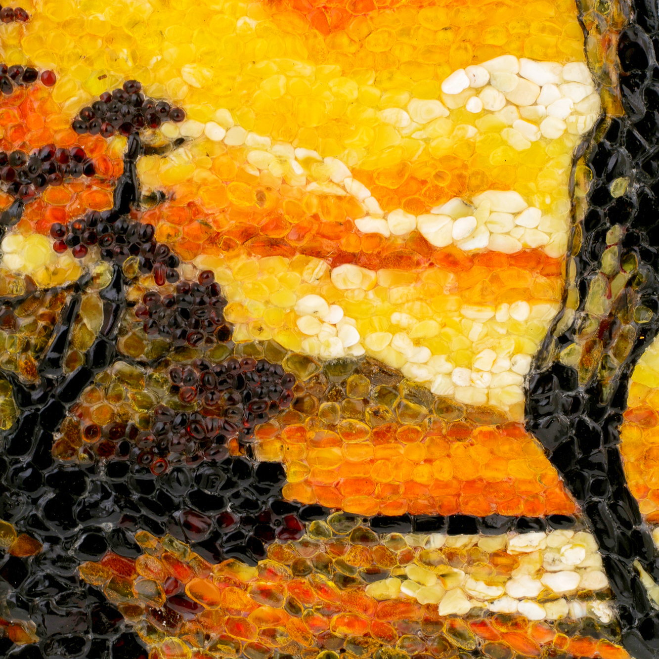 Фон картины, сияющий всеми оттенками закатного неба, создает неповторимую атмосферу. Янтарные крошки, вплетенные в каждую деталь, переливаются золотыми, оранжевыми и алыми бликами, создавая игру света, напоминающую о жарком солнце пустыни. Каждая песчинка на этом фоне словно хранит тепло тысячелетий, превращая картину в настоящий источник энергии.