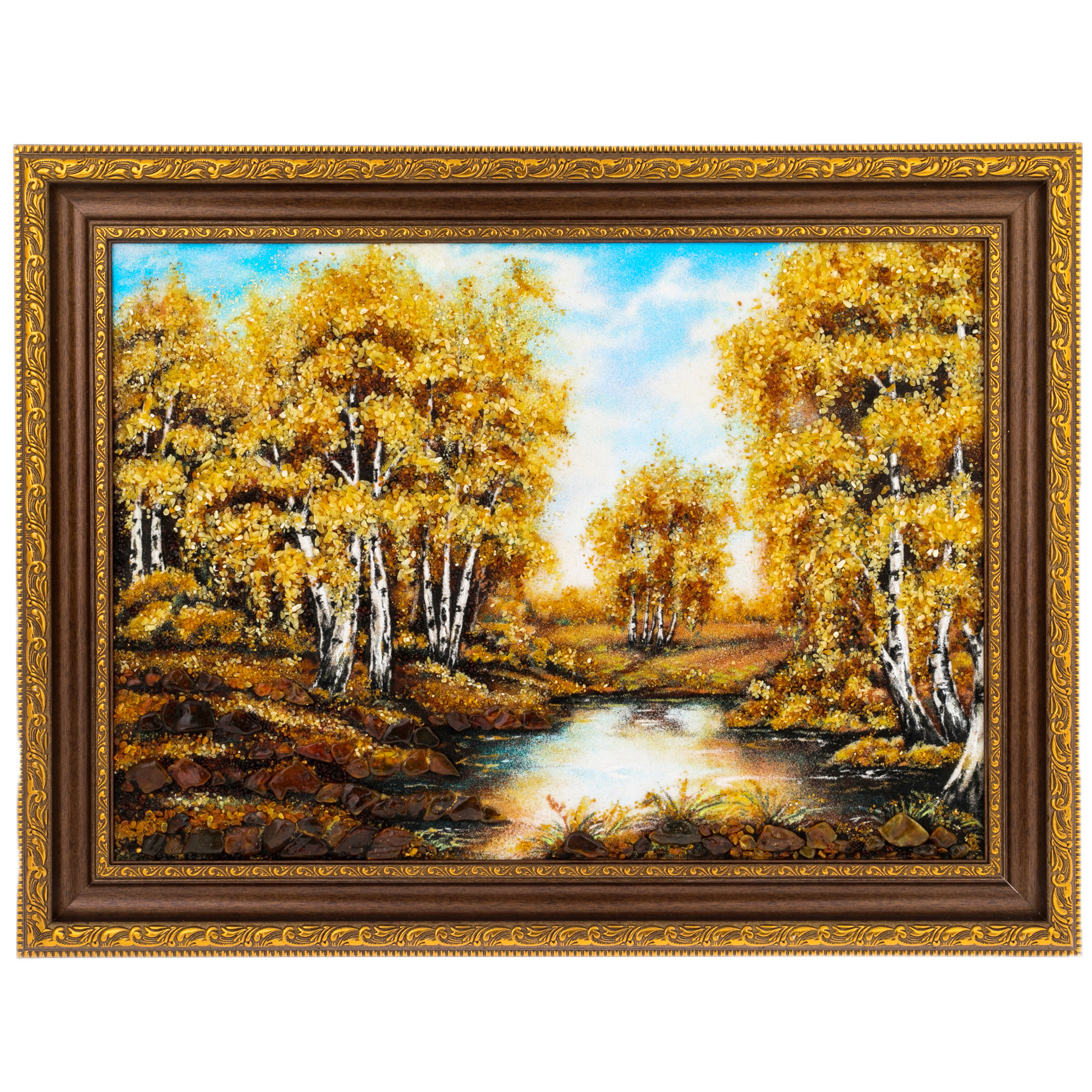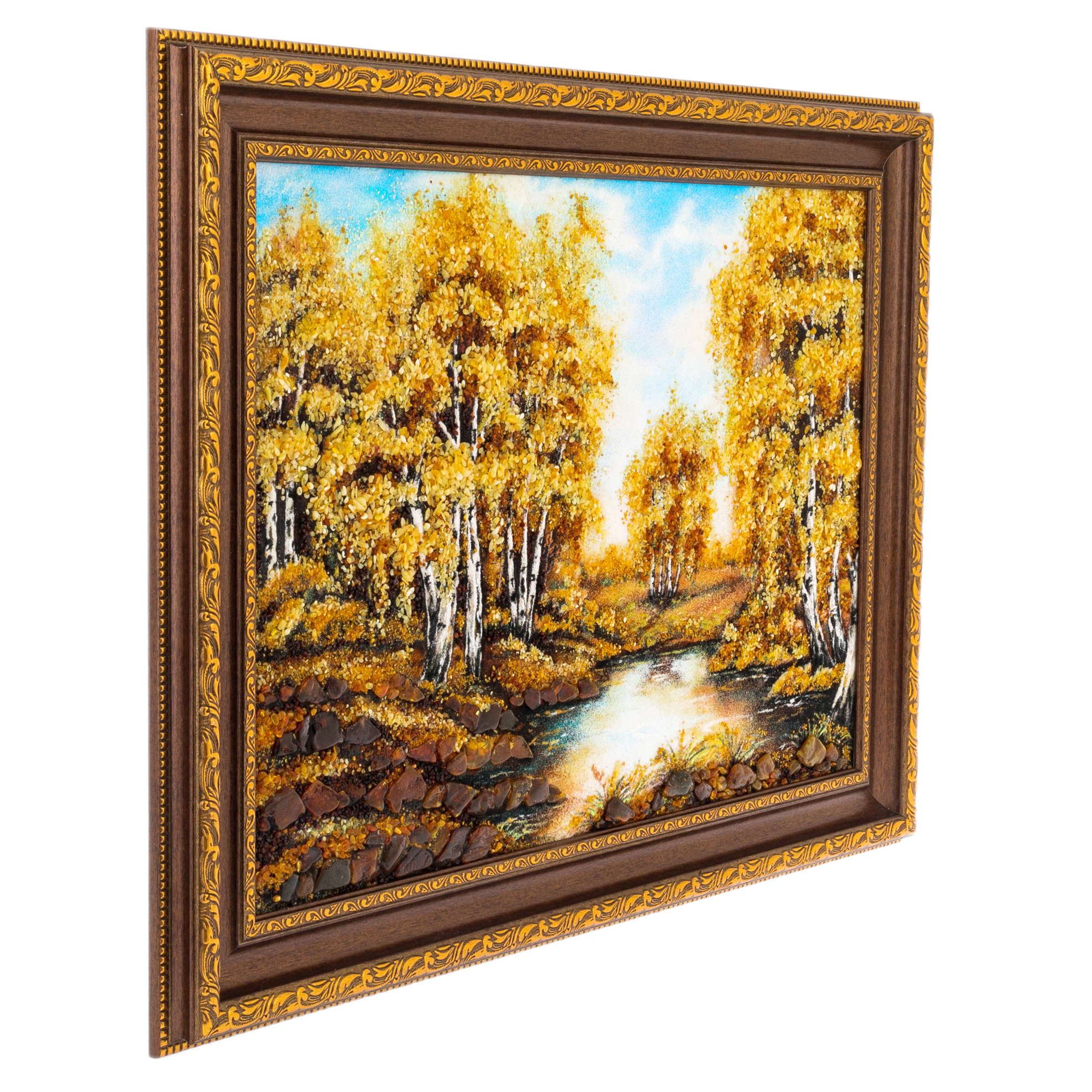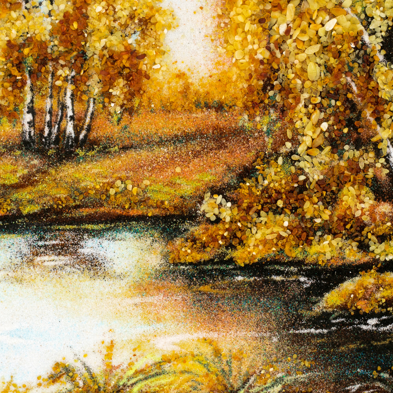 Эта картина — настоящая жемчужина, заключающая в себе глубокую связь с природой. Янтарь, из которого созданы листья и трава, словно несёт в себе тепло и жизненную силу тысячелетий, напоминая о том, что каждый момент бесценен. Глядя на него, чувствуешь, как каждая деталь оживает — слышен шелест листьев, едва тронутых ветром, виден блеск воды, скользящей меж камней, ощущается запах осеннего леса.