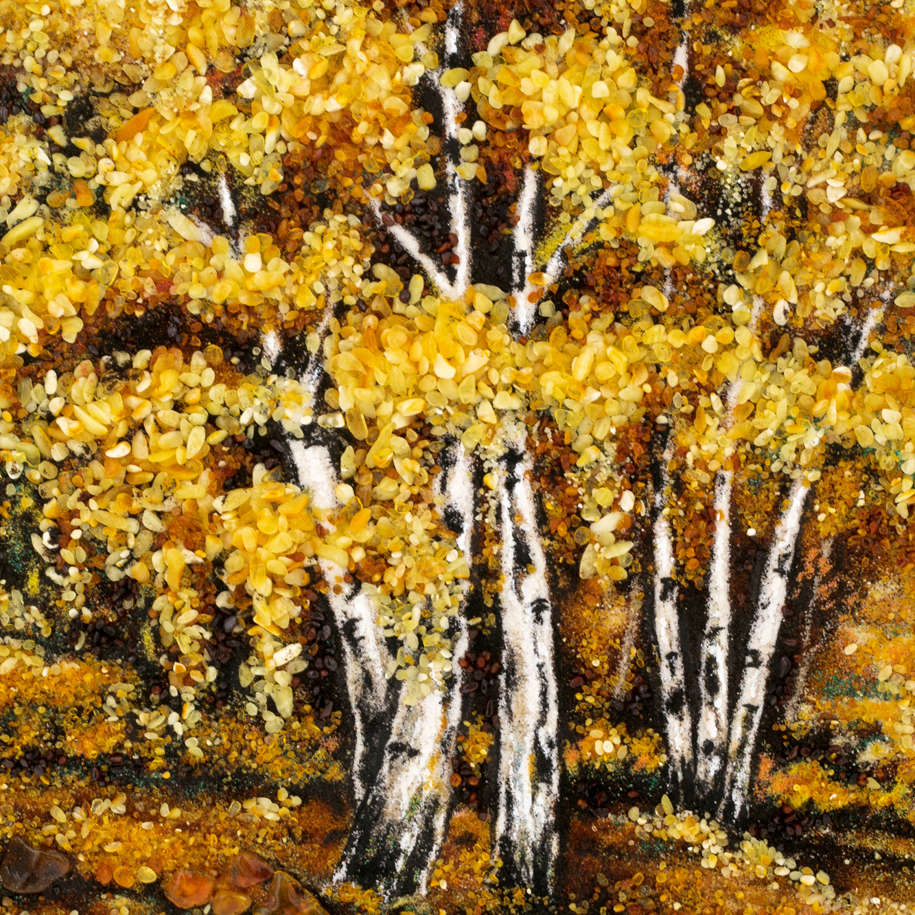 Тонкие, изящные стволы берёз, украшенные янтарём, символизируют чистоту и свет. Белизна их коры выделяется на фоне янтарно-золотистых листьев, создавая контраст нежности и мощи, что передаёт дух русской души — светлый, но стойкий, способный выдерживать любую непогоду. Кроны, выполненные из солнечного янтаря, будто полны света осеннего дня, когда солнце уже низко, но всё ещё одаривает своим тёплым сиянием землю. Эти берёзовые кроны — словно короны природы, осыпанные золотом и огнем уходящего лета.