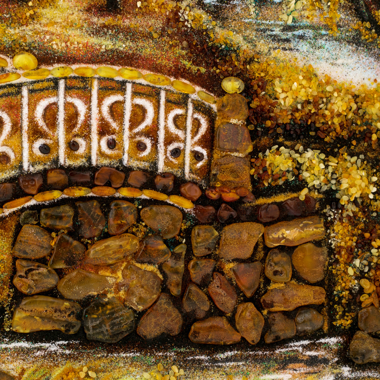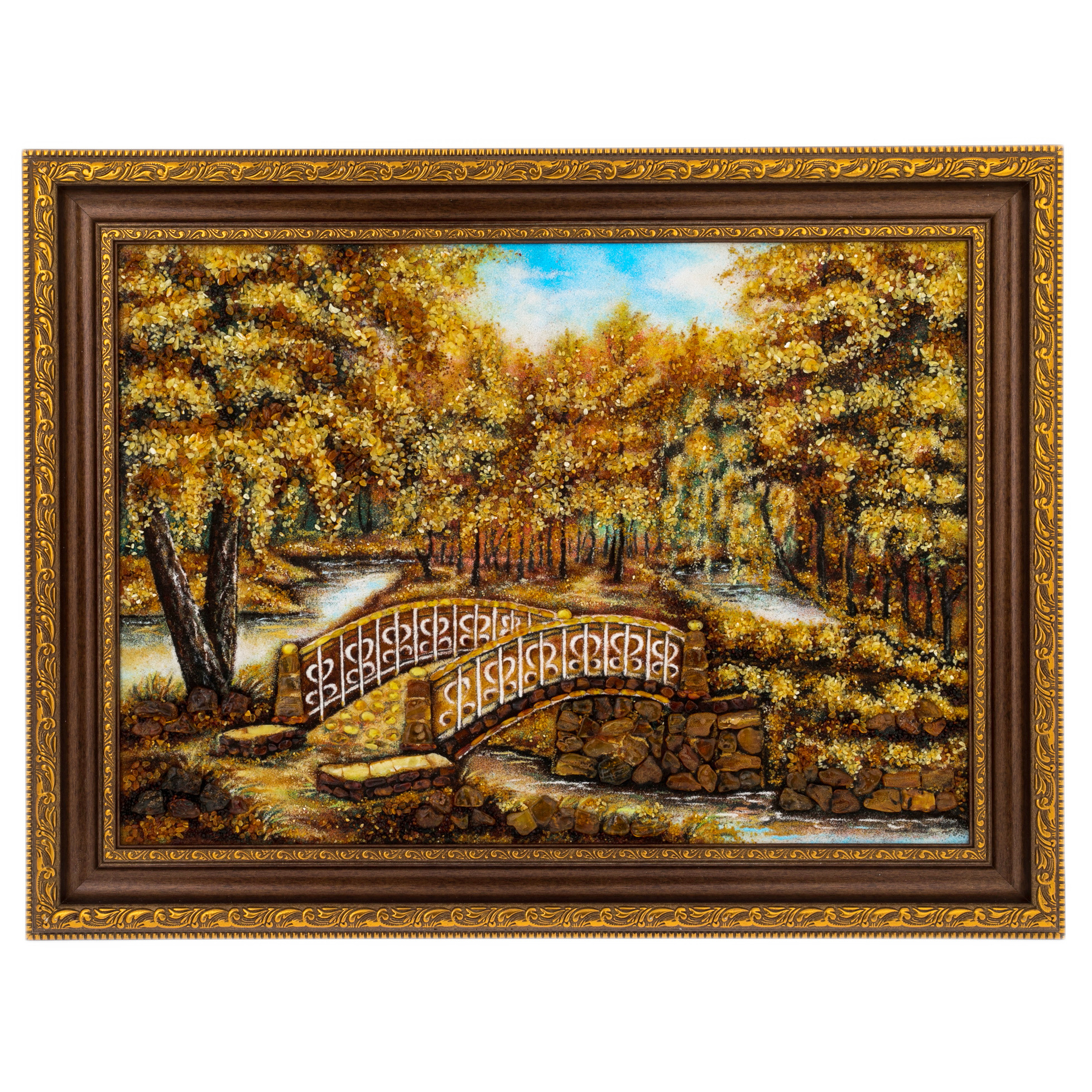 Эта картина — настоящая симфония природы, воплощённая в янтаре. Каждый элемент словно сошёл с полотен великих мастеров, передавая не просто изображение, а целую историю в одном мгновении. Мостик, перекинутый через ручей, символизирует переход от суеты к гармонии, от повседневности к состоянию спокойствия и умиротворённости. Он словно приглашает вас сделать шаг навстречу к себе, к миру, где царит только природа и её вечная красота.