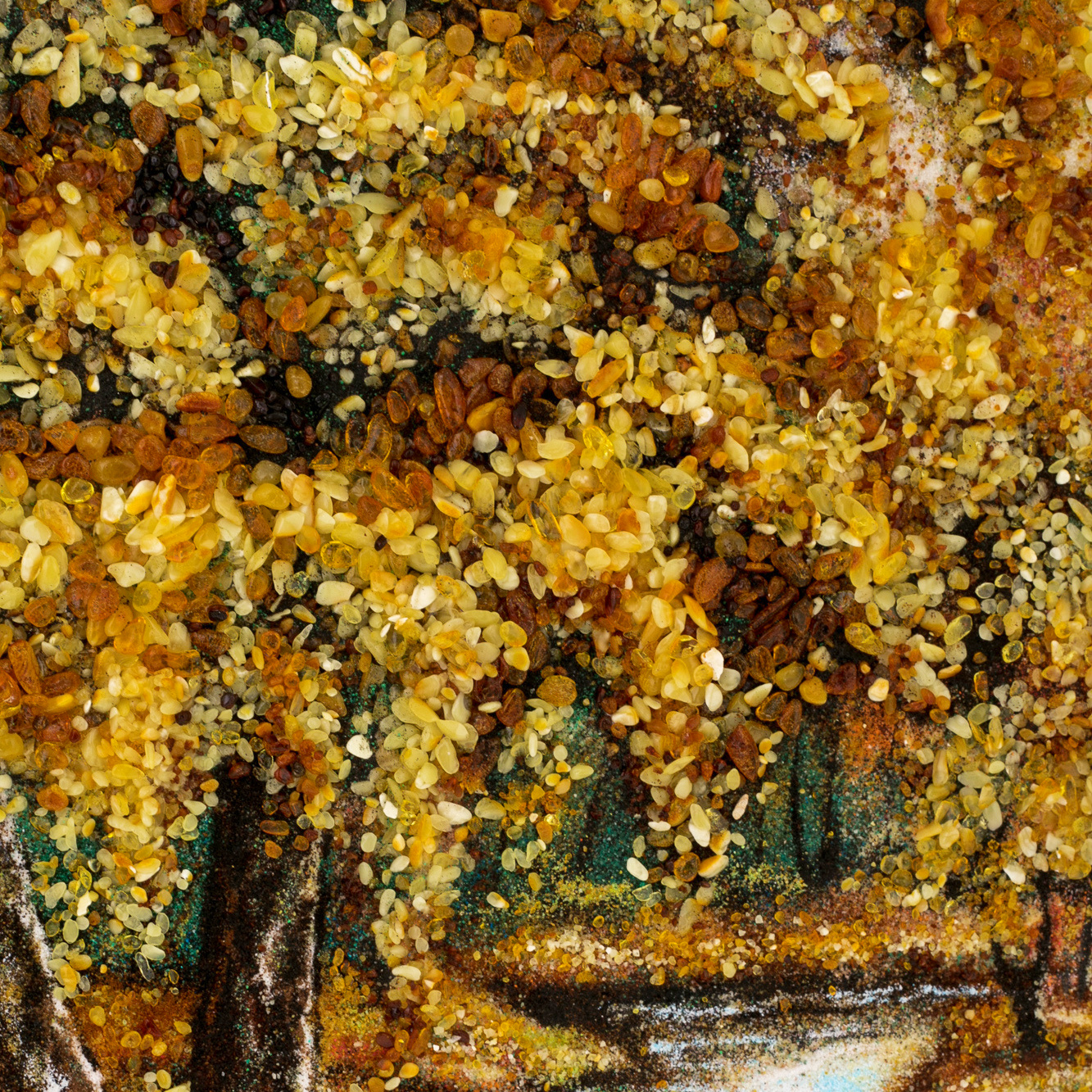 Деревья, выполненные из различных оттенков янтаря, переливаются тёплыми золотыми красками, напоминая о том, что богатство не всегда измеряется материальными благами — порой оно кроется в умении видеть и ощущать прекрасное вокруг. Каждый кусочек янтаря, каждая деталь ветви или листвы — это словно отдельная нота, из которой складывается симфония леса, шуршание осенних листьев и дыхание ветра.