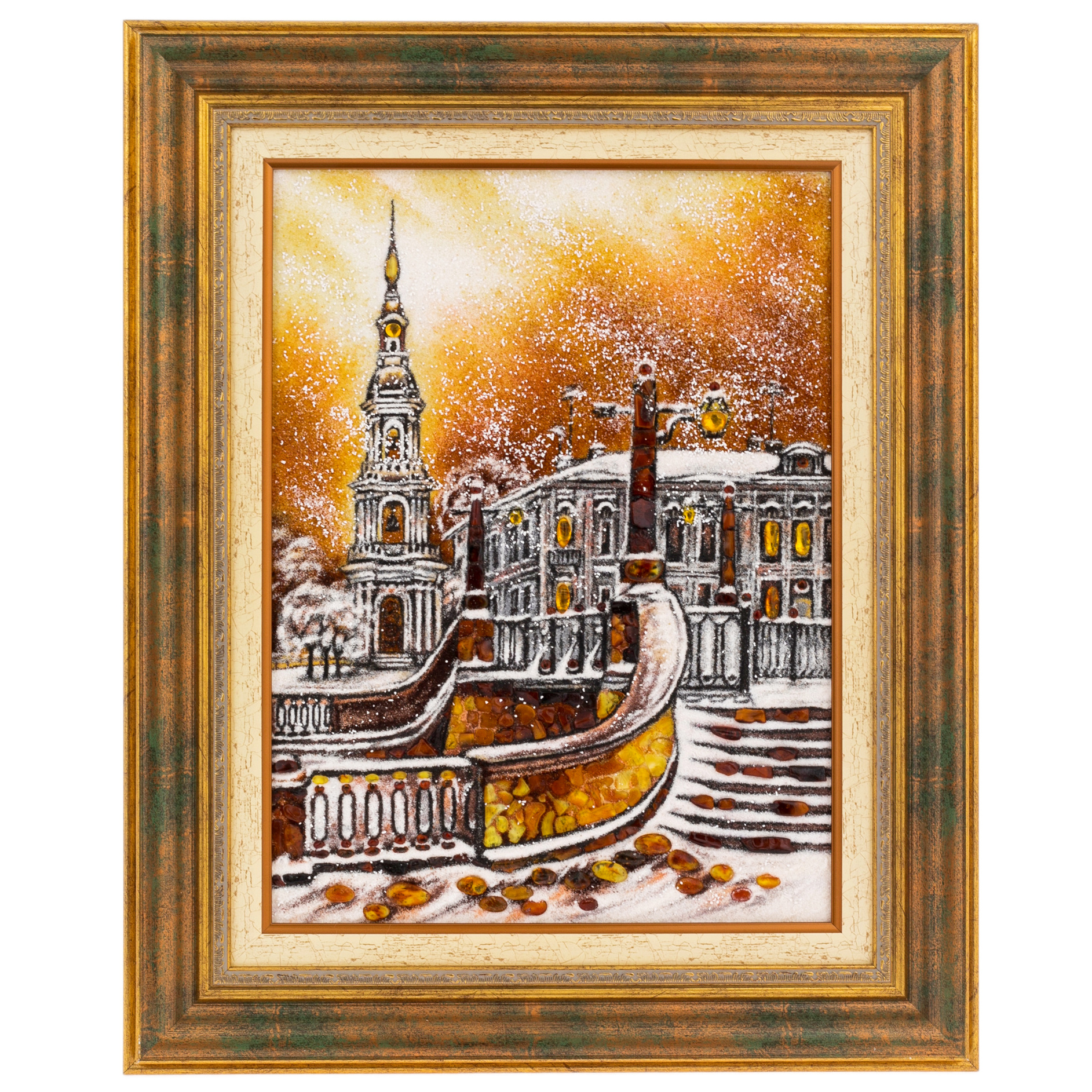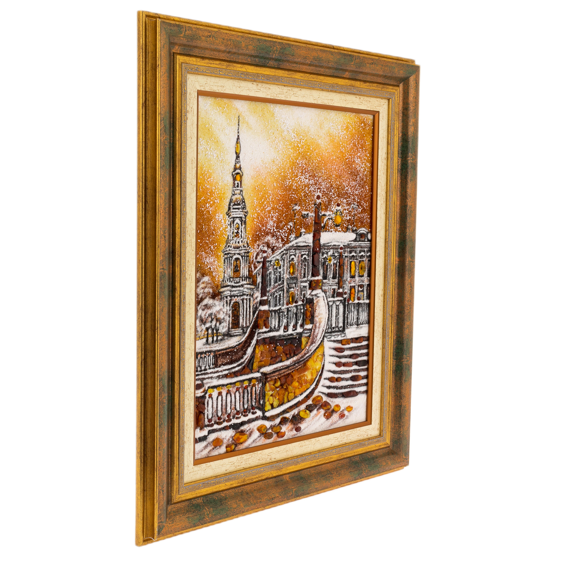 Картина заключена в элегантную раму, дополняющую её совершенство. Её гармония делает произведение не только украшением интерьера, но и символом изысканности и безупречного вкуса. Этот шедевр станет не просто элементом декора, а настоящей драгоценностью, хранящей в себе частицу души Санкт-Петербурга и многовекового мастерства янтарных дел мастеров.