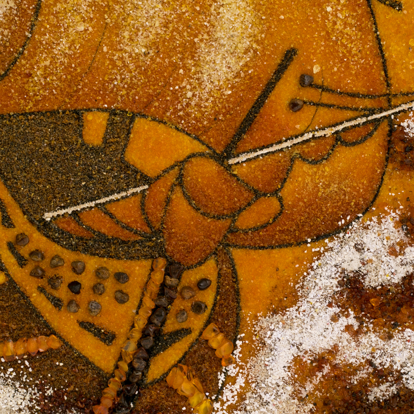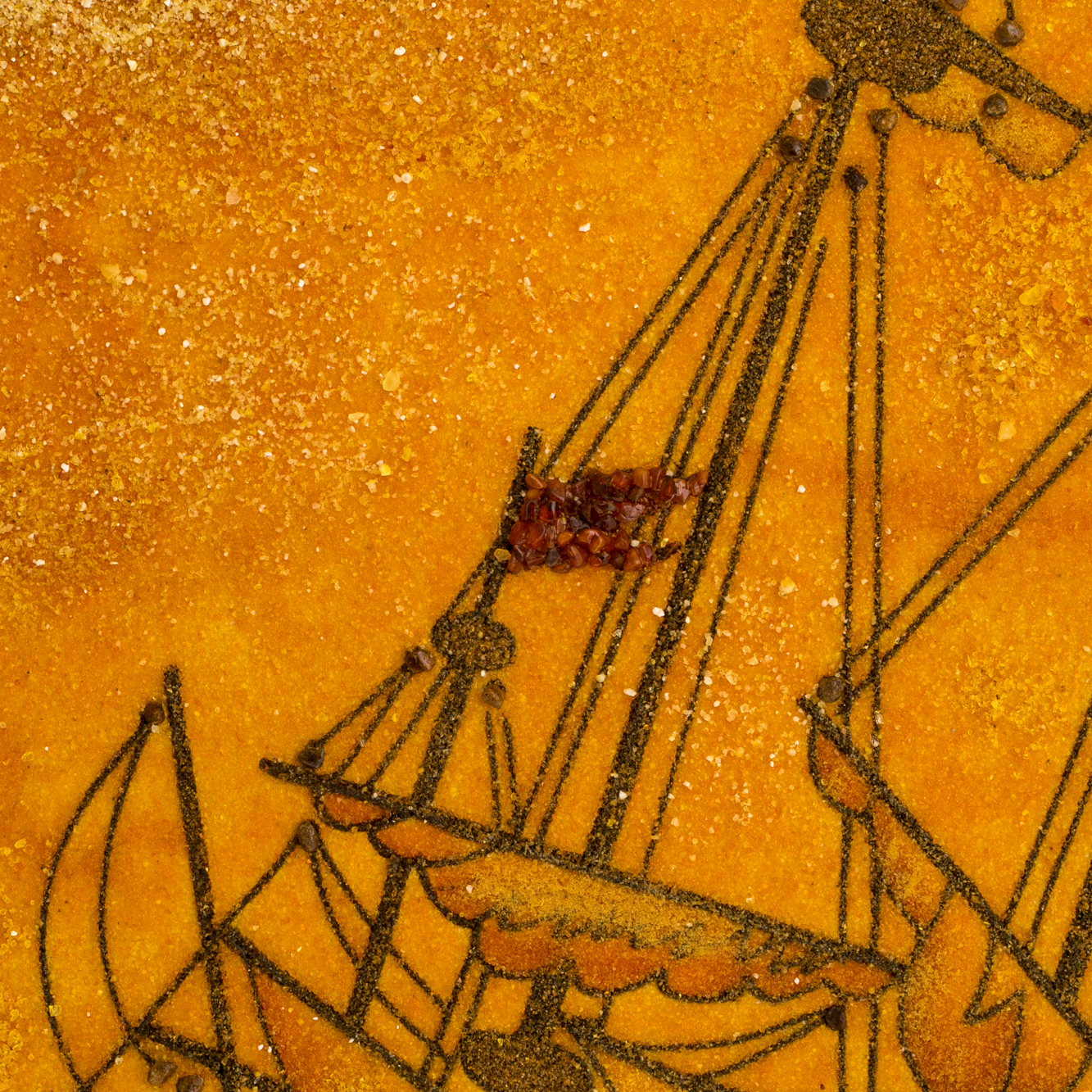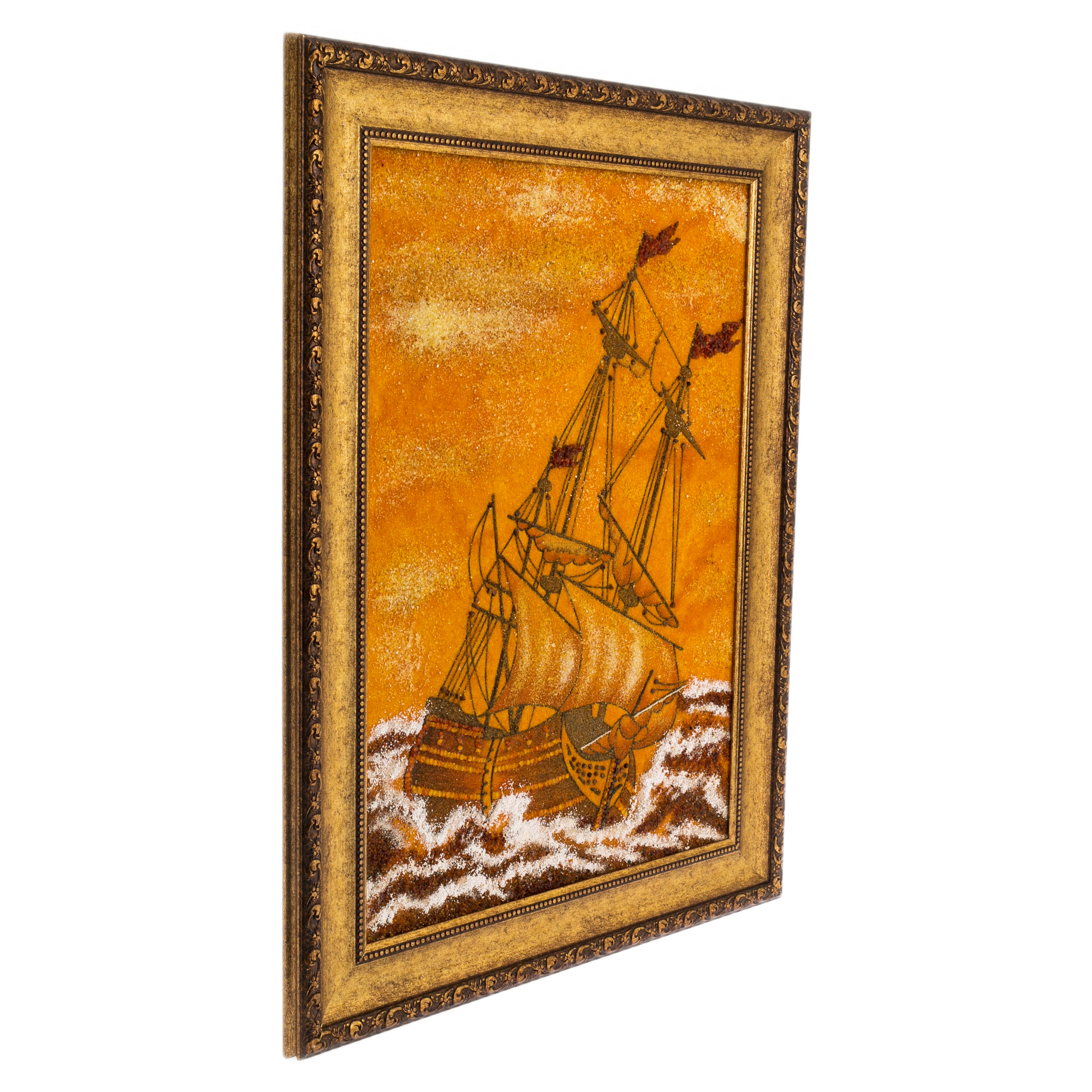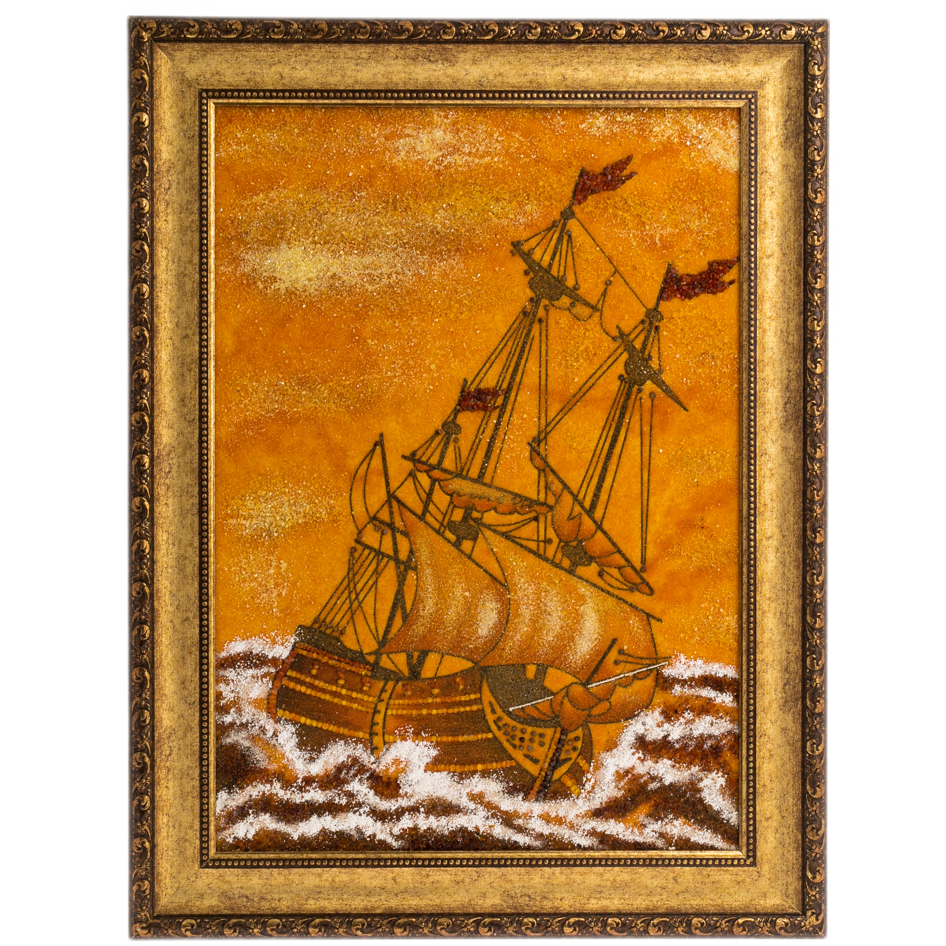 Каждая деталь прорисована с ювелирной точностью: мачты вздымаются ввысь, взметая алые флаги, палуба наполнена невидимым напряжением морского пути, паруса раздуваются ветром, несущим корабль в неизведанные дали. Глубокая текстура янтарной крошки создает иллюзию движения, будто бы корабль действительно рассекает гребни волн, а искры бури застыли в янтарной дымке, отражая гнев и красоту разбушевавшейся природы.
