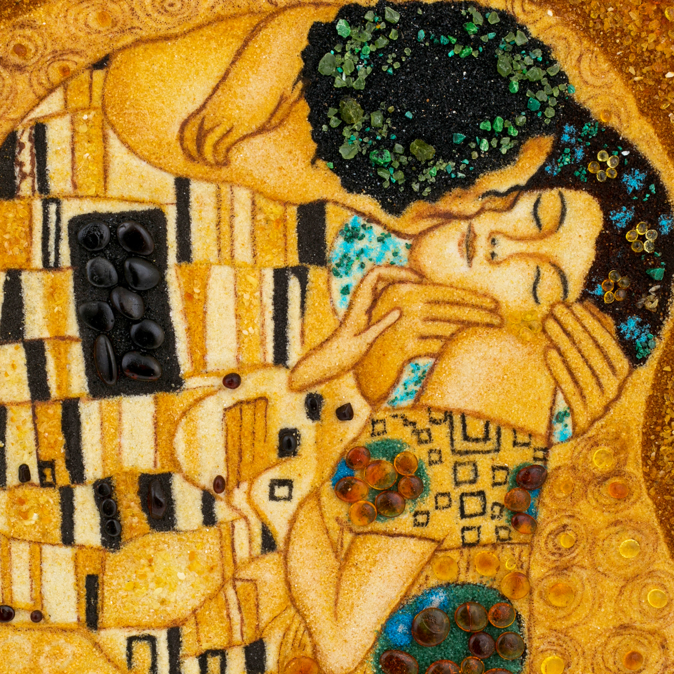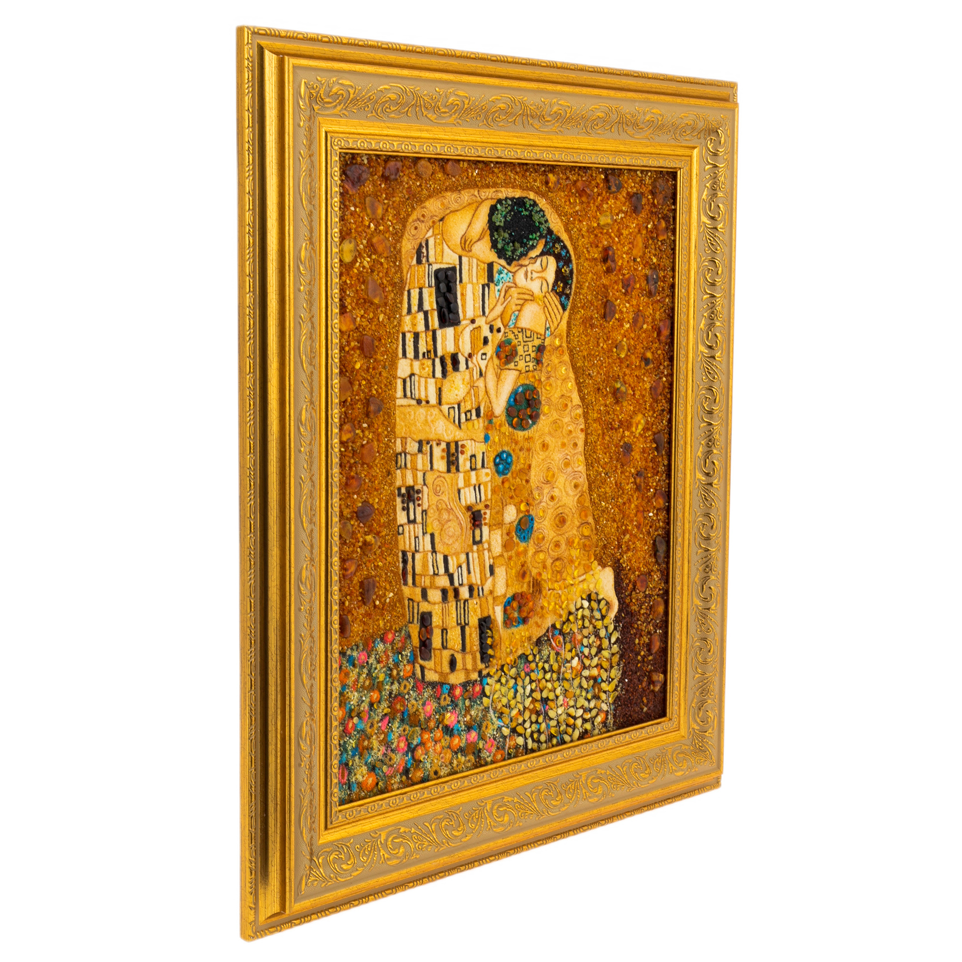 Картина «Поцелуй» по мотивам знаменитого шедевра Густава Климта исполнена вручную с применением натурального янтаря и тончайших мозаичных техник. Сюжет, воспевающий любовь и слияние душ, перенесён на янтарную основу, переливающуюся золотыми, карамельными и медовыми оттенками. Лица влюблённых заключены в вихрь орнаментов, а их одежды собраны из инкрустаций янтаря разных фракций, придающих изображению глубину и объём. Великолепная резная рама с позолотой завершает образ — картина выглядит как сокровище из частной коллекции эпохи модерн.