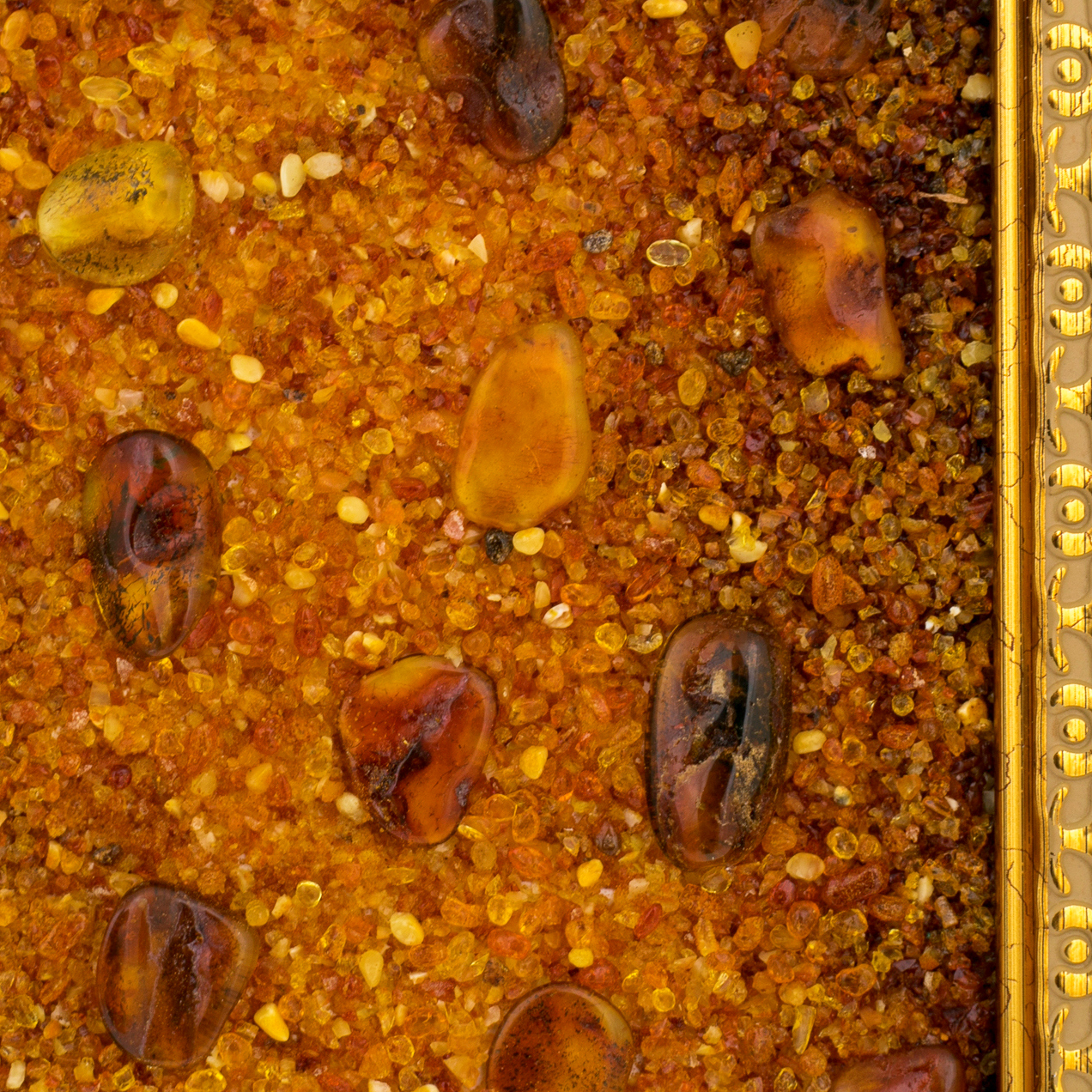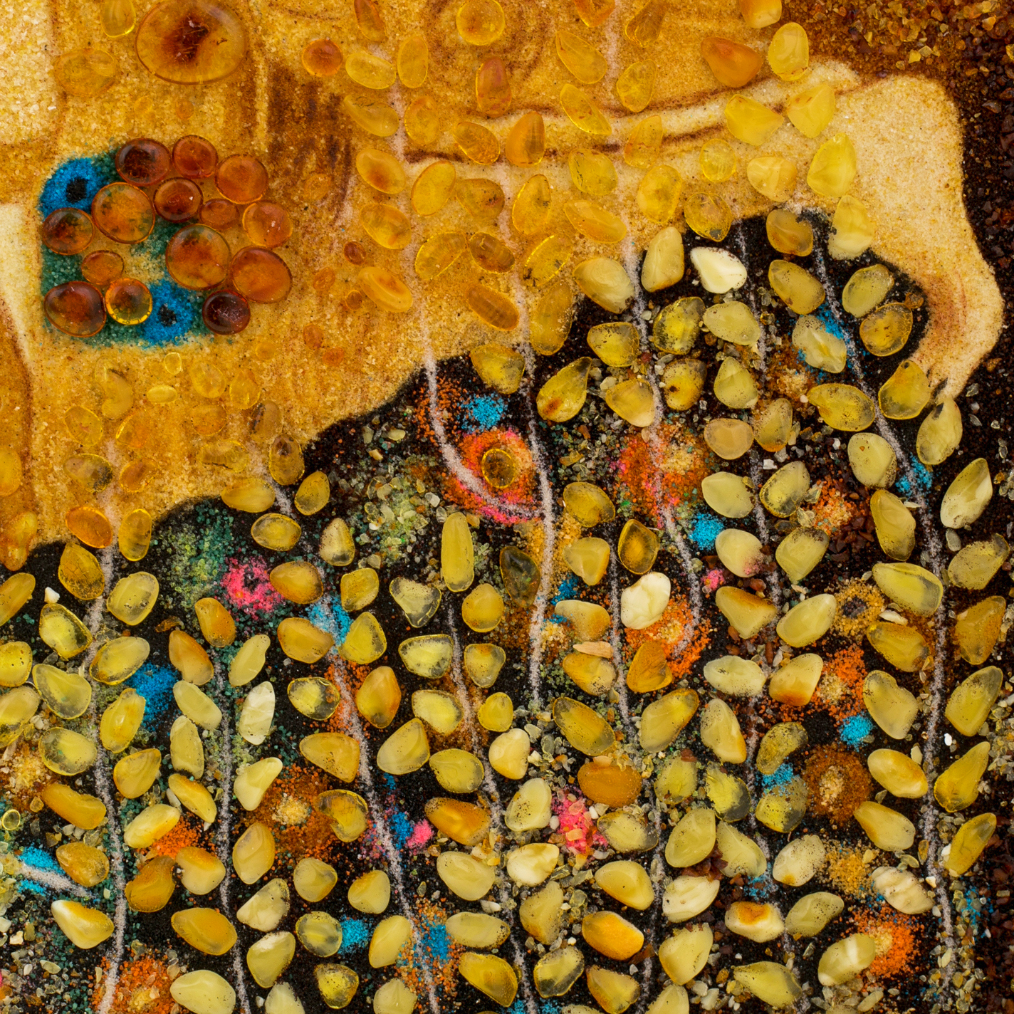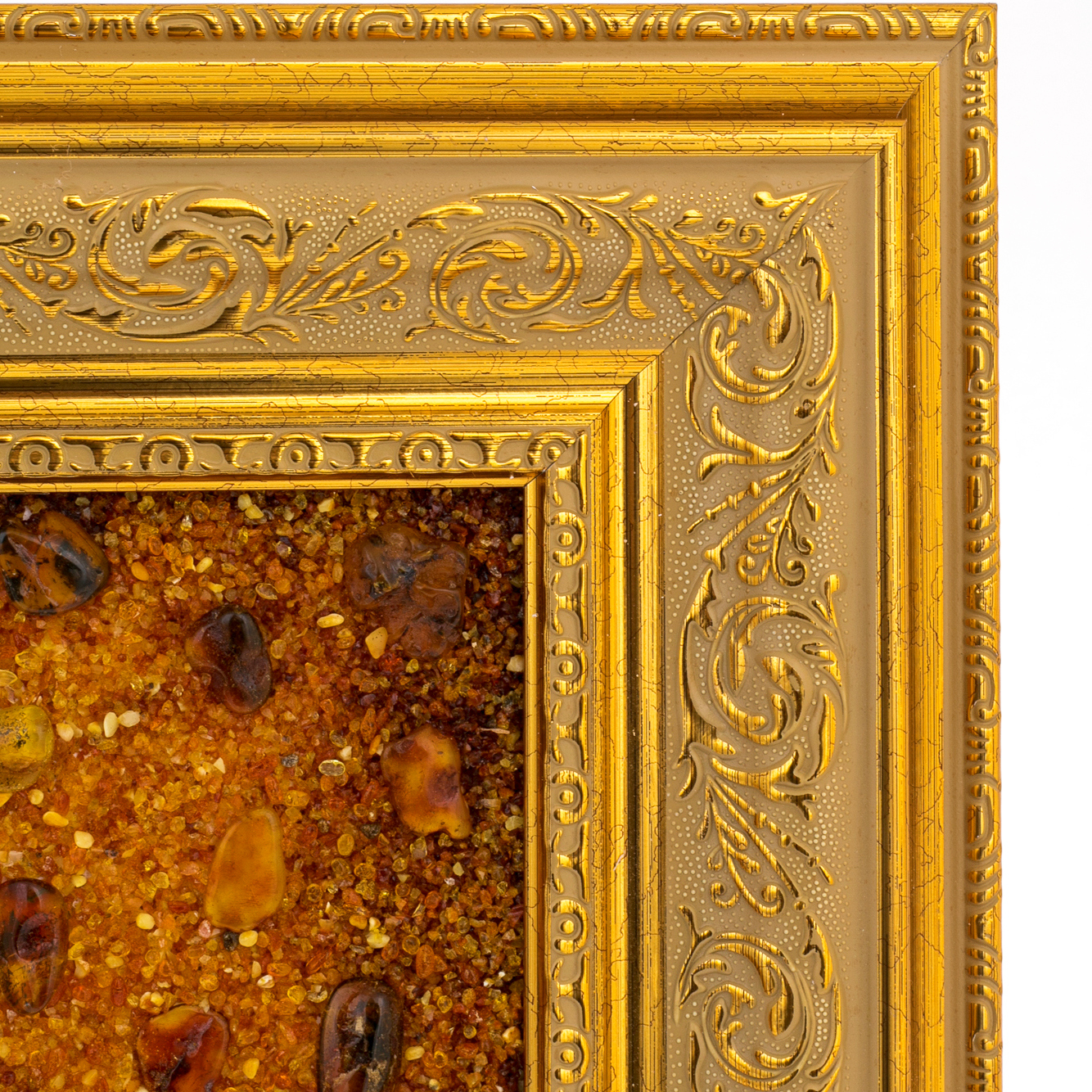 Янтарь, использованный в работе, — не просто декоративный материал. Это древнейший органический камень, чья история уходит на миллионы лет в прошлое. Его природное тепло, способность сохранять энергетику и благотворное воздействие на атмосферу помещения сделали янтарь материалом королей и лекарей. В янтарной мозаике художник словно запечатлевает свет, придавая изображению внутреннее сияние. Каждый фрагмент отшлифован вручную, каждый элемент выложен с ювелирной точностью, создавая не картину — реликвию.