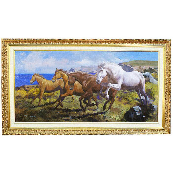 Картина, написанная маслом, с изображением бегущих по прибрежному плато лошадей — это не просто живописное полотно, а манифест свободы, силы и одухотворённой природы. Белый скакун, вырвавшийся вперёд, словно символизирует чистоту и лидерство, в то время как тёплые рыжевато-коричневые масти других лошадей подчеркивают живую энергию движения. Пейзаж за спинами животных — прозрачное небо, синее море, скалистый берег — придаёт сцене дыхание простора и делает композицию почти кинематографичной.