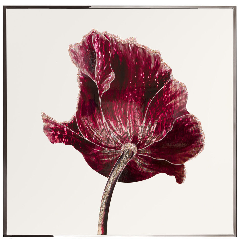 Встречайте эксклюзивное декоративное панно "Opium" от знаменитой итальянской фабрики Visionnaire, где каждый фрагмент работы является отражением мастерства и эстетического изящества. Огненно-бордовый мак, распустившийся в динамичном движении, напоминает о вечном танце природы, о страсти, заключённой в совершенстве формы. Его лепестки, созданные из цветного стекла и перламутра, переливаются в свете, словно капли густого вина, пролитые на безупречно гладкую поверхность. Они кажутся живыми, наполненными дыханием ночи, в которой рождаются мечты, вызывая у зрителя ощущение мистического гипноза.
