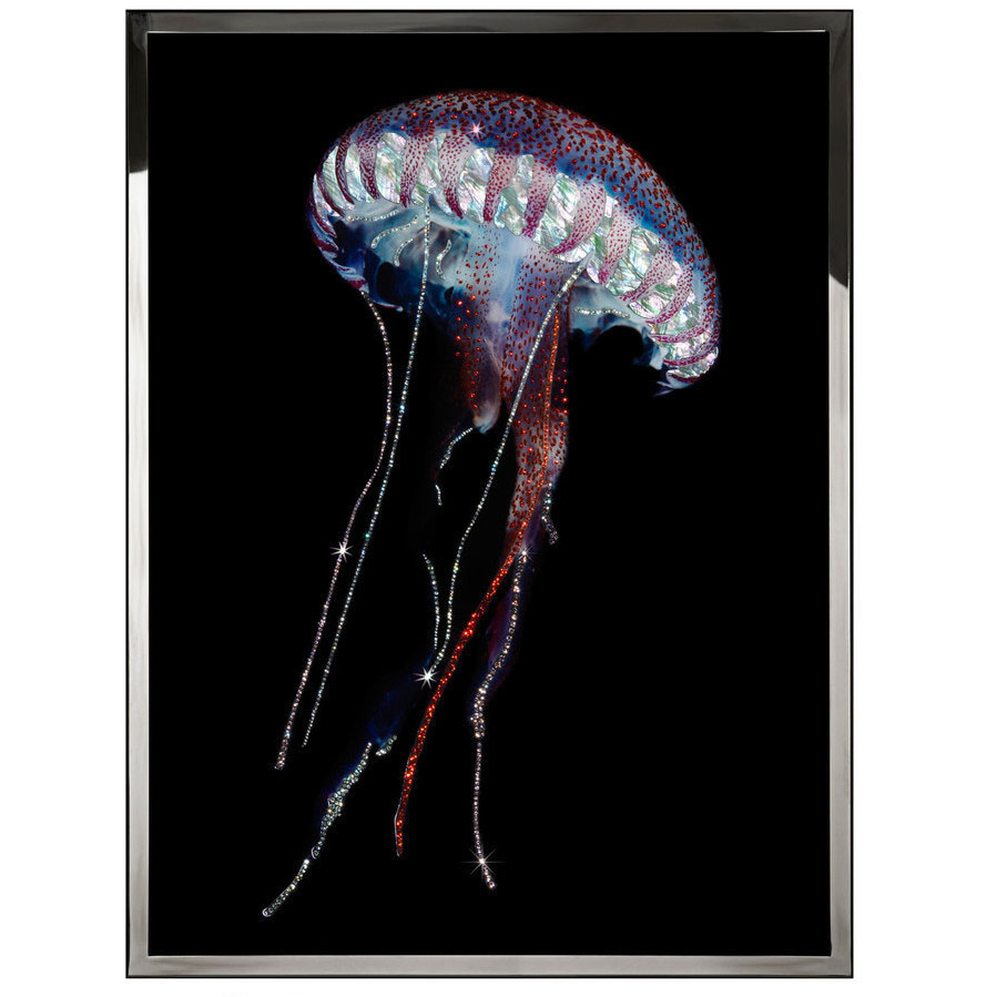 Плексигласовая основа создает иллюзию невесомости, подчёркивая эфемерность образа, его связь с необъятной водной стихией. Гладкая поверхность не просто отражает свет, она впитывает его, преломляя и играя оттенками, создавая эффект глубины. Этот фон усиливает контраст между загадочностью медузы и роскошным блеском её кристальных акцентов, превращая панно в визуальную поэму о величии природы.