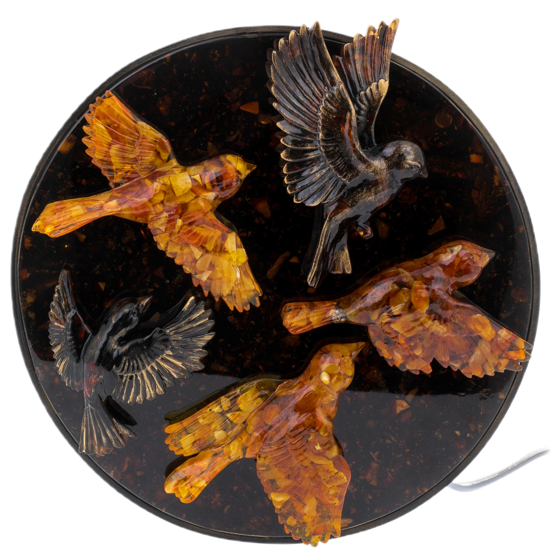Настенное панно-светильник «Птицы» — произведение, в котором живопись уступает место скульптурной поэзии. На глубоком фоне темного янтаря вспорхнули резные силуэты птиц — лёгких, трепетных, словно застигнутых в момент полета. Композиция собрана на круглой плоскости, обрамленной лаконичным корпусом, а под встроенной подсветкой янтарные крылья вспыхивают прозрачным золотом. Это не просто источник мягкого, рассеянного света, а предмет, насыщенный внутренним движением и эмоциональной глубиной. Светильник украшает собой пространство, усиливая его атмосферу — будь то кабинет, гостиная или коллекционное собрание.