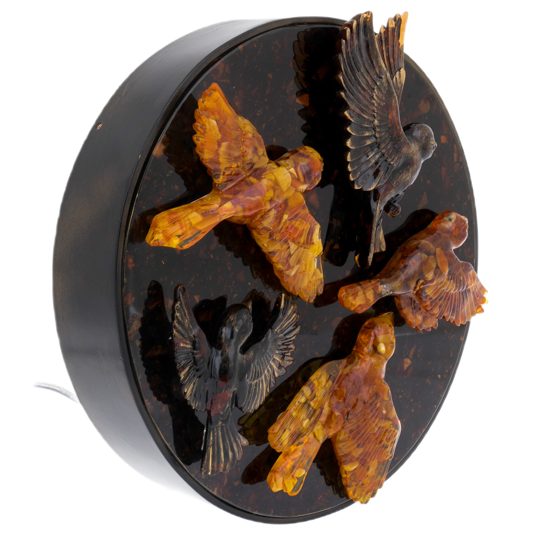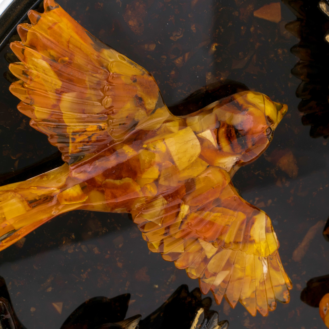 Каждая фигура птицы — результат филигранной ручной работы с балтийским янтарем. Полупрозрачные желтые и медовые фрагменты, отобранные по оттенку и плотности, соединены в единый образ посредством точной шлифовки и полировки. Янтарь, древнейший из органических минералов, рожденный миллионы лет назад и вобравший в себя солнечную энергию доисторических лесов, воспринимается как символ света, защиты и гармонии. Благодаря разнообразию его природной цветовой палитры, каждая птица обретает индивидуальность: одни кажутся легкими и весенними, другие — таинственными и ночными. В темной части композиции читается глубина и строгость, в золотистой — тепло и движение.