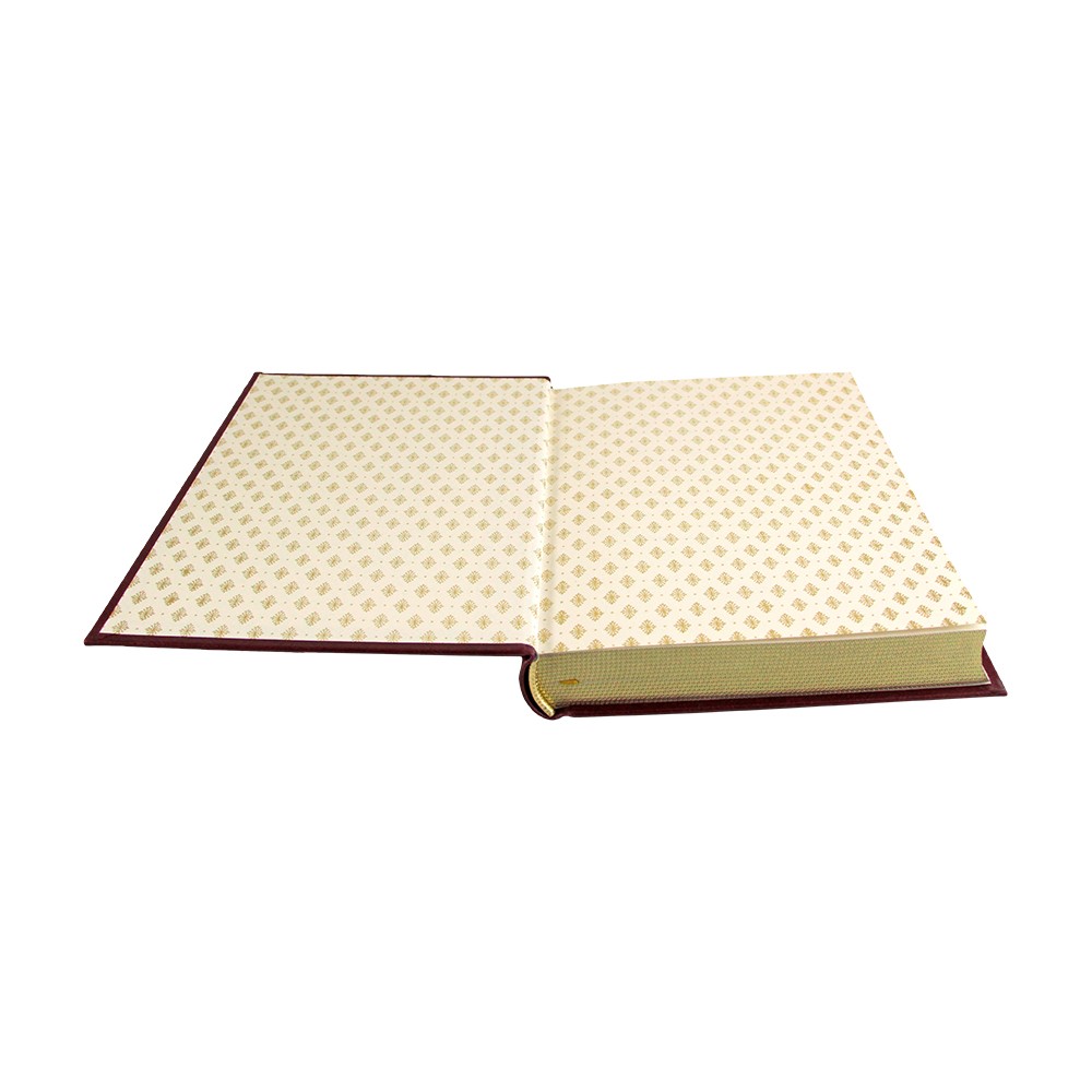 Исполнение: Переплёт ручной работы из натуральной кожи. Форзац из дизайнерской бумаги. 4 бинта на корешке, ручной обработки. Каптал золотой из натуральной кожи. Обрез блока торшонированный золотой. Инкрустация кожаной вставкой с печатью. Тиснение блинтовое и золотой фольгой. Ляссе.