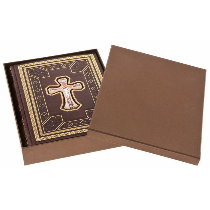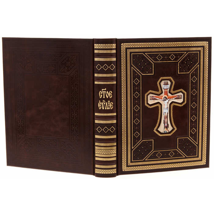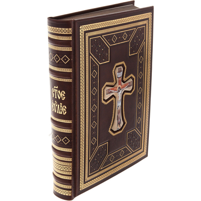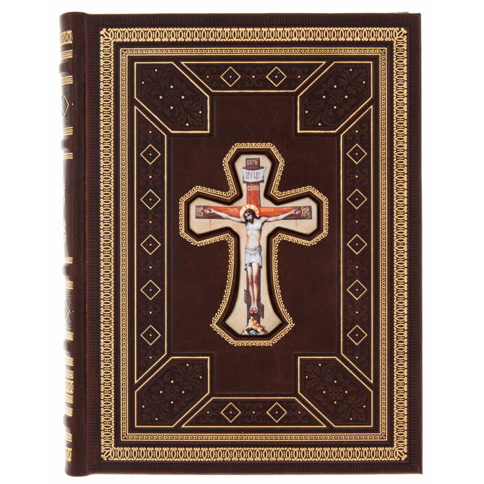 Особенности оформления:переплёт ручной работы из натуральной кожи; форзац из дизайнерской бумаги; 5 бинтов на корешке, ручной обработки; каптал золотой из натуральной кожи; обрез блока торшонированный золотой; тиснение блинтовое и золотой фольгой; ляссе; крупный шрифт.