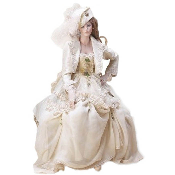Авторская кукла «Тина» — это изысканная интерпретация образа аристократки конца XIX века, воплощённая в фарфоре, текстиле и ручной работе. Изящный силуэт, изогнутая поза, задумчивый взгляд и лёгкий наклон головы создают впечатление живой женственности и едва уловимой грусти. Белоснежное платье, украшенное кружевами, оборками и вышивкой в виде пастельных цветов, словно написано акварелью на шёлке. Каждая деталь наряда проработана с ювелирной точностью: от тончайших складок на юбке до декоративных стежков на жакете.