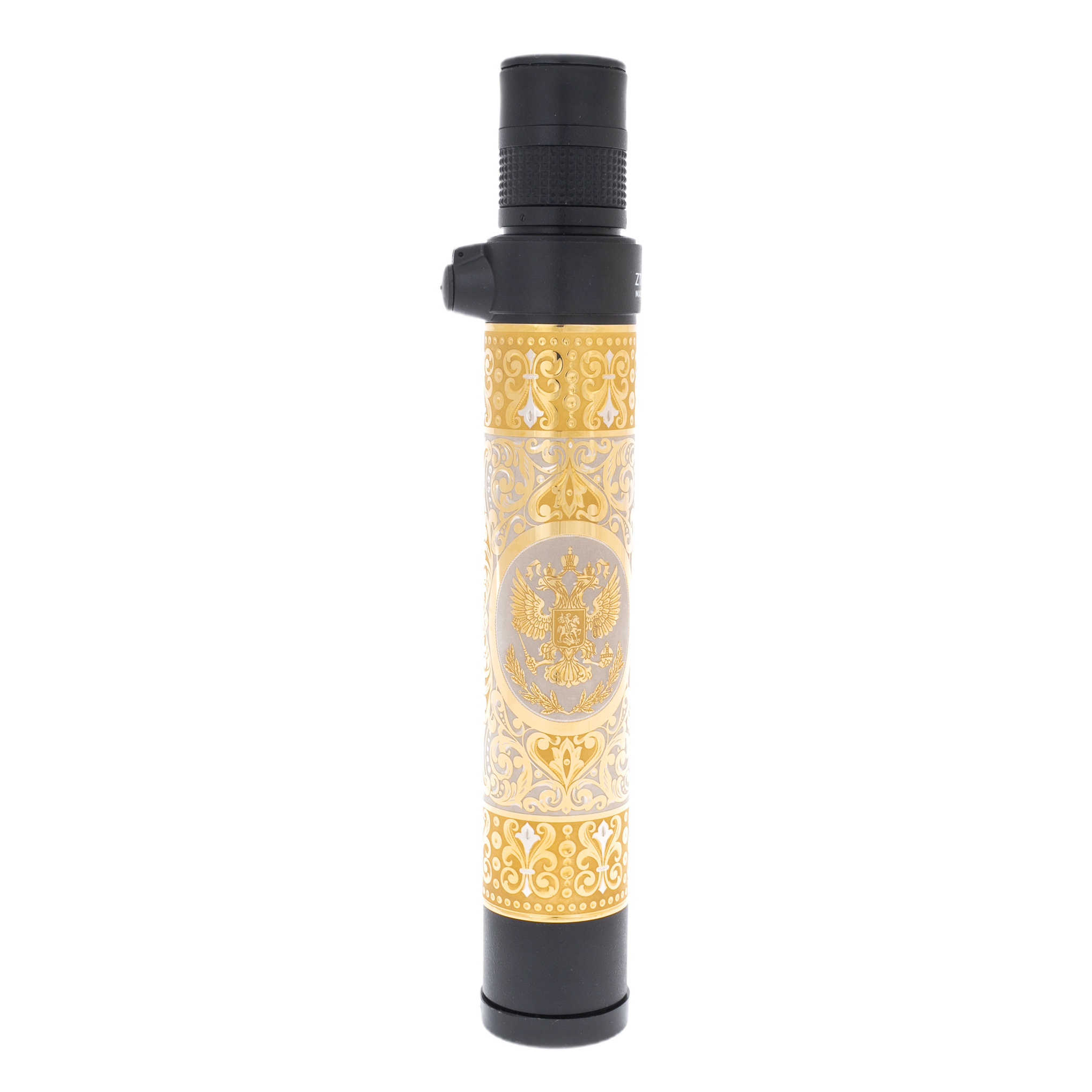 Вороненая сталь корпуса контрастирует с сияющей позолотой, образуя гармонию темного и светлого — баланс силы и утонченности, фундаментальной прочности и изысканной роскоши. В центре композиции — герб России, двуглавый орел, расправивший крылья над миром, символ власти, державности, традиции, осознанного величия, неподвластного времени. Орнамент, сплетающийся вокруг, будто эхо царских дворцовых украшений, придает предмету статус произведения искусства.