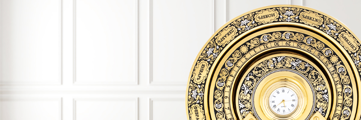 Умельцы из Златоуста знают толк в обработке камня. Из сверхтвёрдого, монолитного куска нефрита они выточили постамент идеальной формы, отшлифовали и отполировали его до блеска. Сам календарь декорирован драгоценной золотой вуалью. Изображения солнца, луны, растительный орнамент и цифры выполнены в технике сложной гравировки резцом и иглой. После травления рисунок обрёл выразительность за счёт чередования матовых и глянцевых оттенков. Конструкция выглядит как ценный музейный экспонат и по праву станет семейной реликвией.