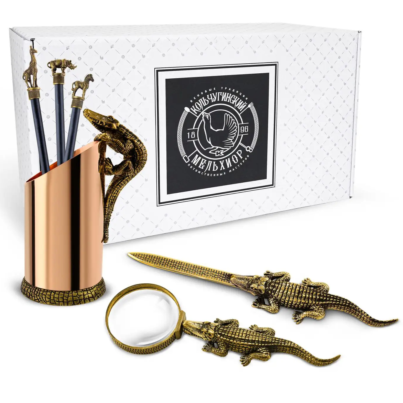 Медный набор канцелярский "Сафари" с чернением, 5 предметом: подставка для бумаги+карандашница+3 карандаша