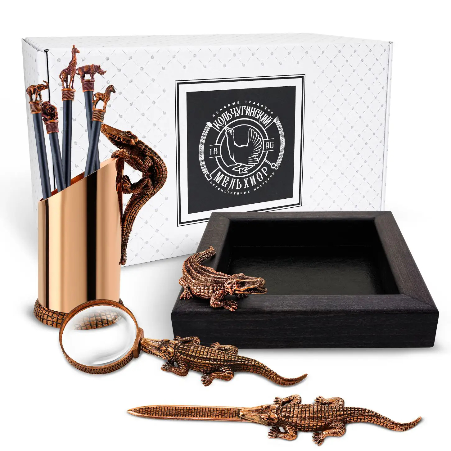 Медный набор канцелярский "Сафари" с чернением, 9 предметов: лупа+нож для писем+подставка для бумаги+карандашница+5 карандашей