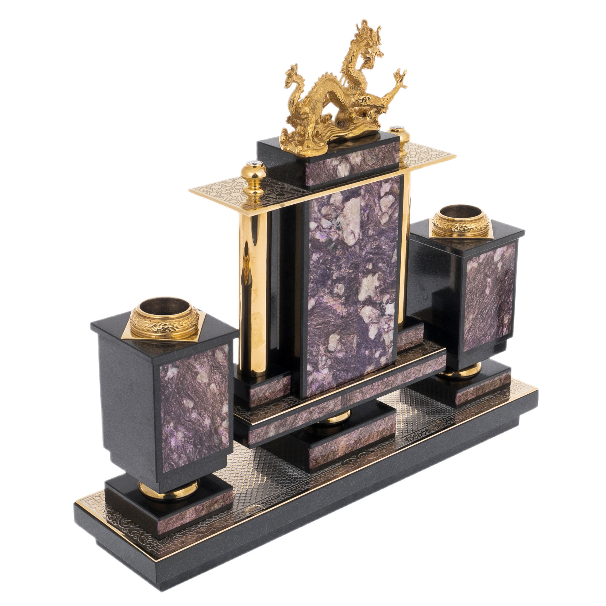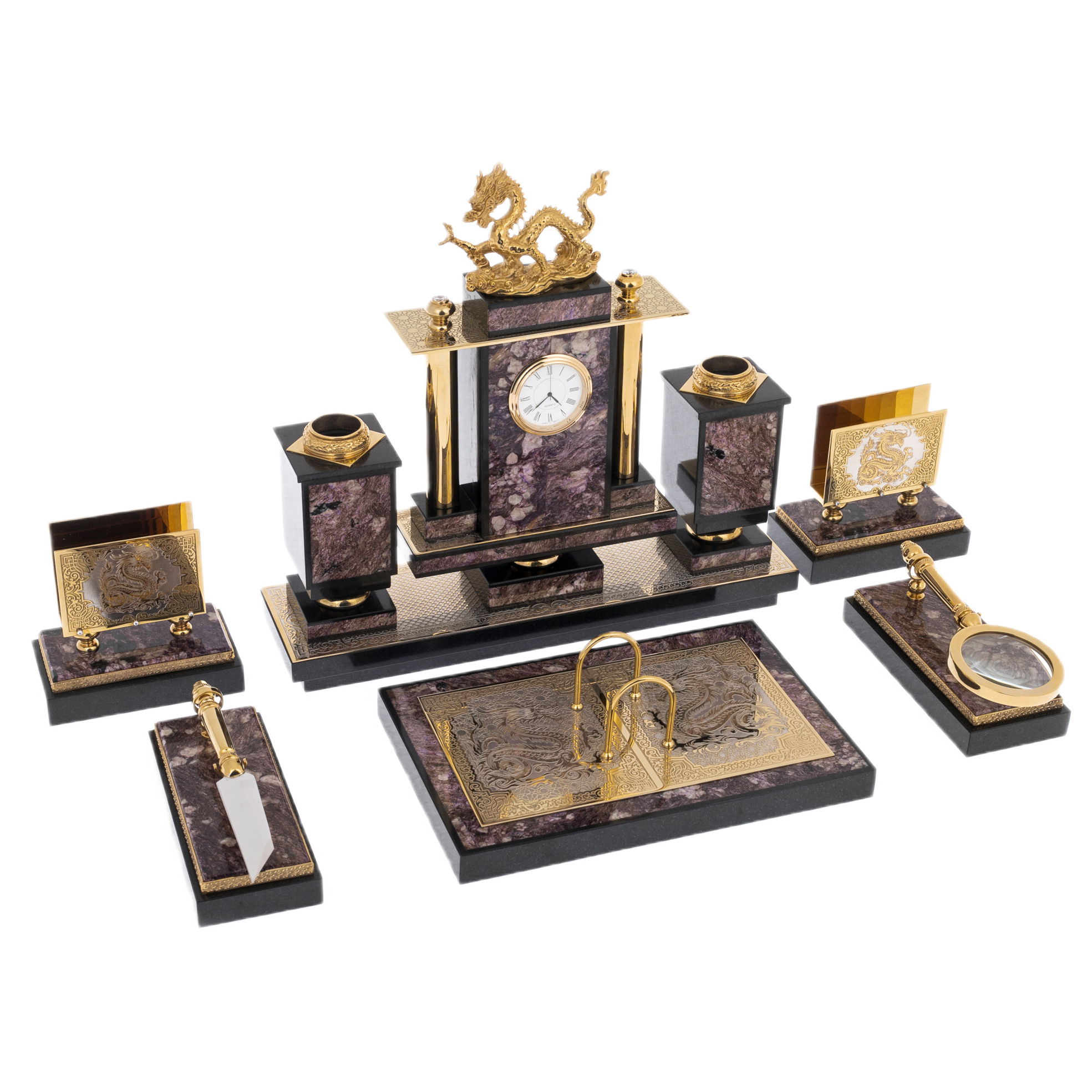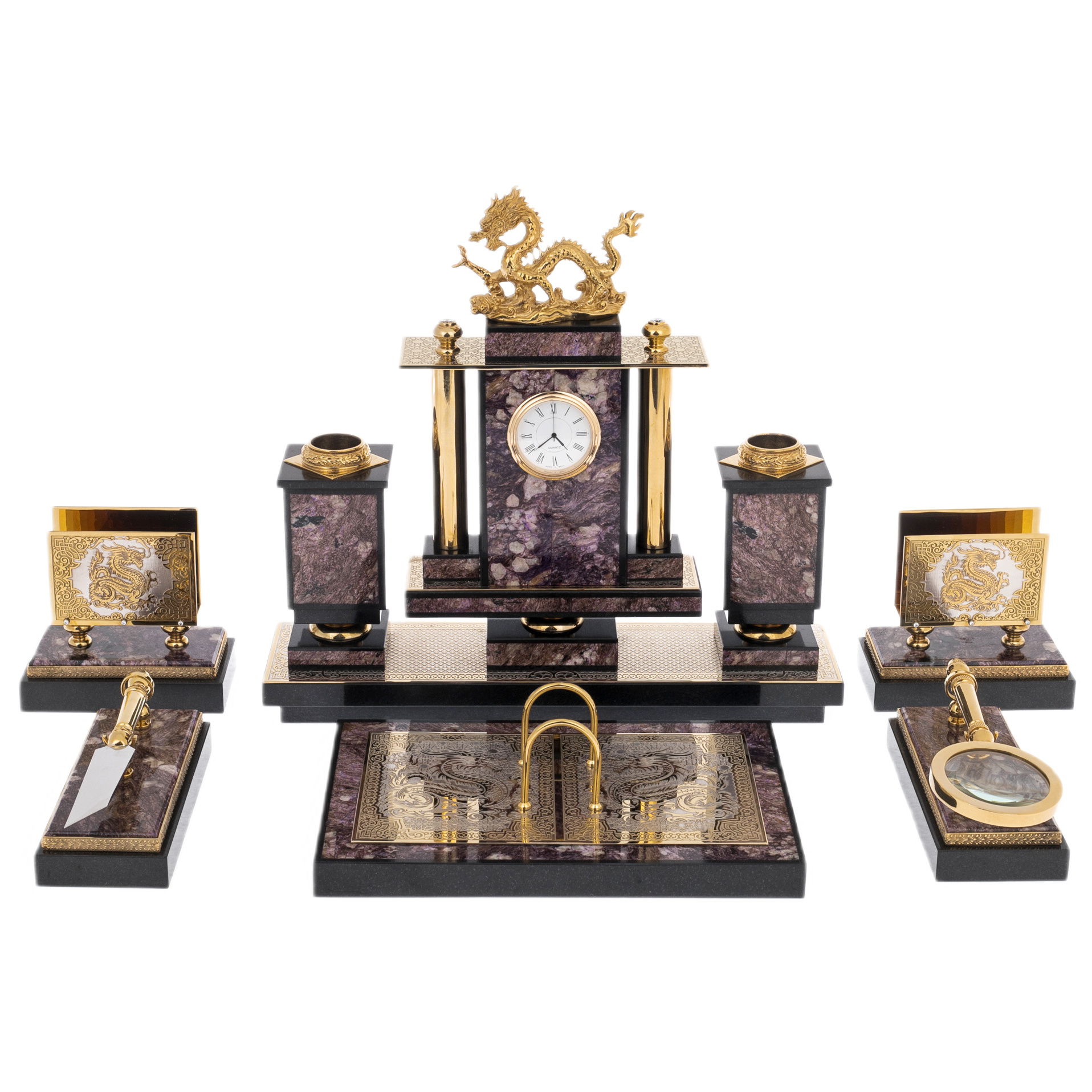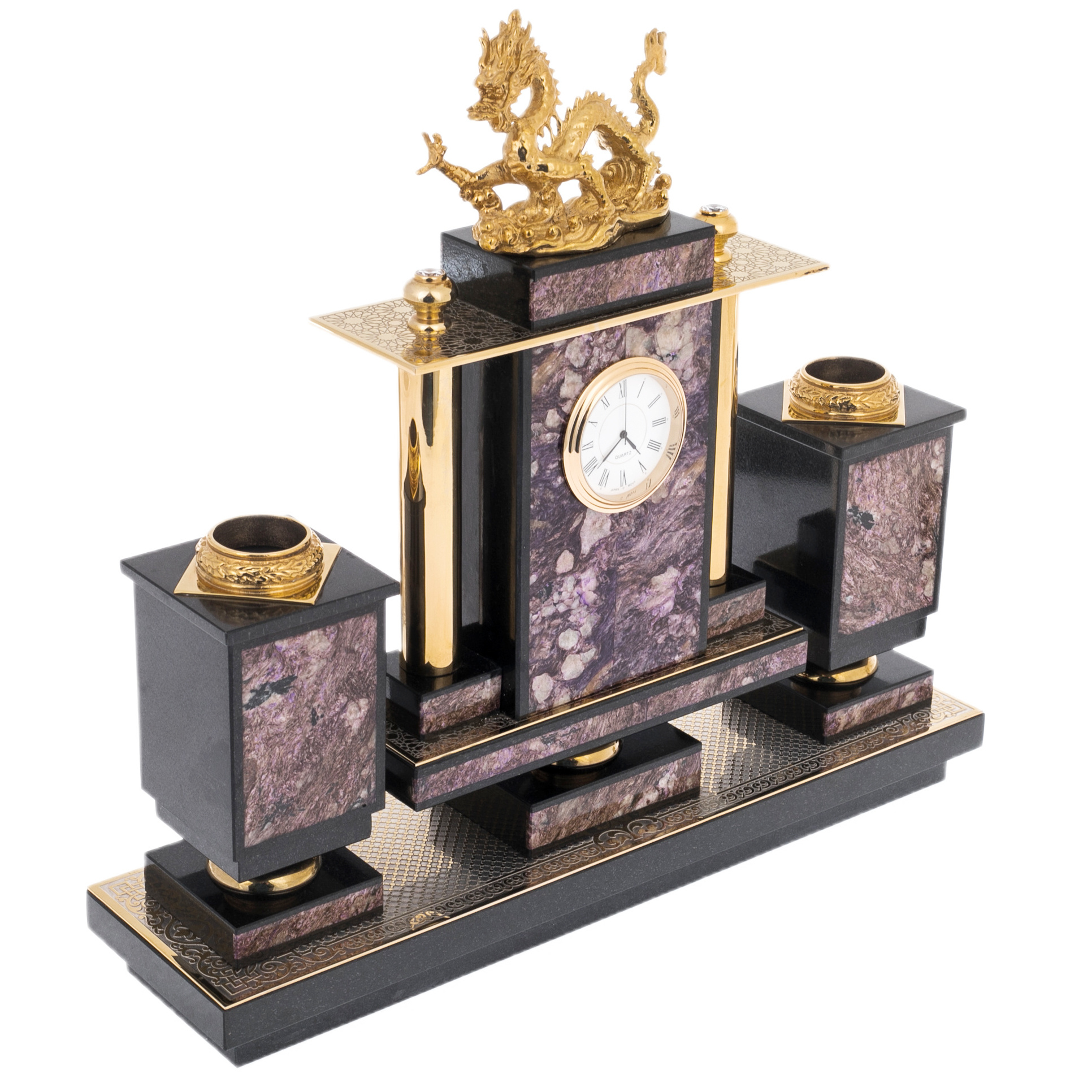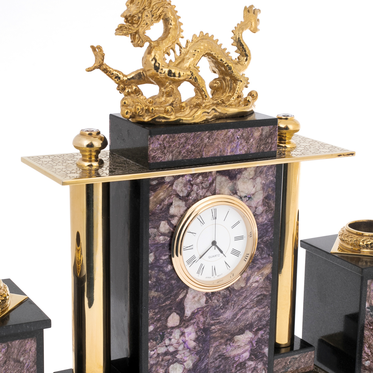 В центре композиции возвышаются массивные часы, выполненные из редкого чароита. Этот камень, с его глубокими сиренево-фиолетовыми оттенками, излучает энергию и спокойствие, напоминая о мудрости и уверенности, необходимых для принятия стратегических решений. Венчает часы фигурка дракона, покрытая золотом, — универсальный символ власти, защиты и процветания. Этот мифический страж, извиваясь в величественном танце, является аллегорией силы, неподвластной времени.
