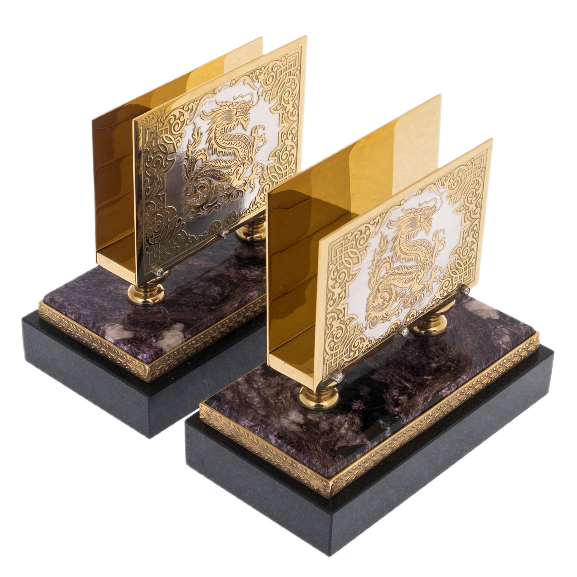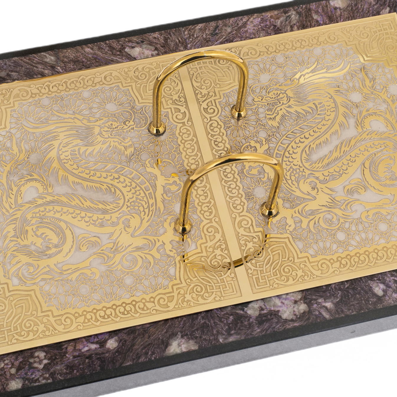 Золотые элементы, украшающие набор, искусно дополняют природную текстуру чароита. Два массивных стакана для ручек и карандашей с утонченными золотыми узорами, словно колонны древнего храма, обрамляют центральный блок, добавляя в композицию торжественности. Визитницы, выполненные с использованием техник гравировки, хранят тайны деловых контактов, подчеркивая статус владельца.