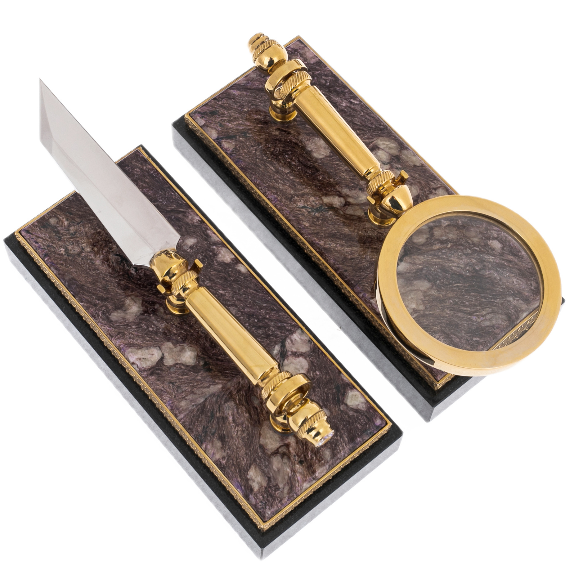 Особого внимания заслуживают нож для бумаг и лупа. Эти предметы не только функциональны, но и исполнены в стиле ренессансной роскоши: золото в сочетании с чароитом образует уникальный союз практичности и красоты. Держатель для перекидного календаря, украшенный выгравированными изображениями драконов, добавляет коллекции нотку эксклюзивности, связывая функциональность и художественную ценность.